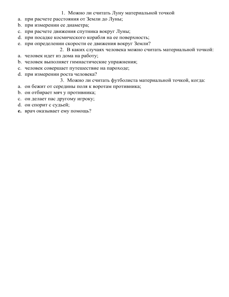 1. Можно ли считать Луну материальной точкой a. при расчете расстояния от Земли до Луны; b. при измерении ее диаметра; c. при расчете движения спутника вокруг Луны; d. при посадке космического корабля на ее поверхность; e. при определении скорости ее движения вокруг Земли? 2. В каких случаях человека можно считать материальной точкой: a. человек идет из дома на работу; b. человек выполняет гимнастические упражнения; c. человек совершает путешествие на пароходе; d. при измерении роста человека? 3. Можно ли считать футболиста материальной точкой, когда: a. он бежит от середины поля к воротам противника; b. он отбирает мяч у противника; c. он делает пас другому игроку; d. он спорит с судьей; e. врач оказывает ему помощь?