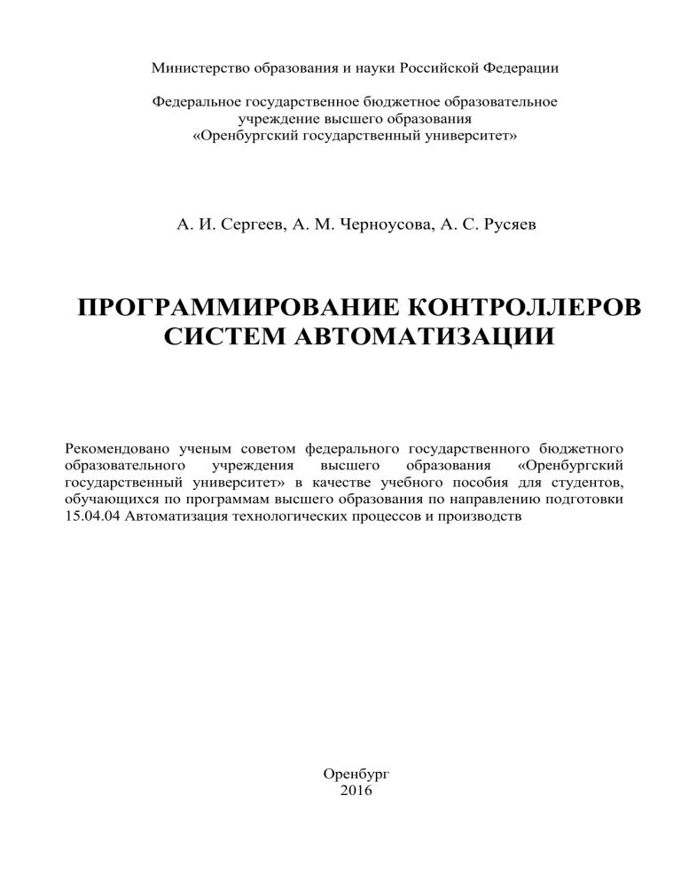 Министерство образования и науки Российской Федерации Федеральное государственное бюджетное образовательное учреждение высшего образования «Оренбургский государственный университет» А. И. Сергеев, А. М. Черноусова, А. С. Русяев ПРОГРАММИРОВАНИЕ КОНТРОЛЛЕРОВ СИСТЕМ АВТОМАТИЗАЦИИ Рекомендовано ученым советом федерального государственного бюджетного образовательного учреждения высшего образования «Оренбургский государственный университет» в качестве учебного пособия для студентов, обучающихся по программам высшего образования по направлению подготовки 15.04.04 Автоматизация технологических процессов и производств Оренбург 2016 УДК 004.41/92(076) ББК 32.973-018я7 С32 Рецензент – кандидат технических наук В. В. Тугов С32 Сергеев, А. И. Программирование контроллеров систем автоматизации: учебное пособие / А. И. Сергеев, А. М. Черноусова, А. С. Русяев; Оренбургский гос. ун-т. – Оренбург: ОГУ, 2016. – 125 с. ISBN 978-5-7410-1649-7 Учебное пособие содержит теоретические сведения о программируемых логических контроллерах (ПЛК), программируемых реле и других элементах систем автоматизации. Представлен материал о принципах программирования различных устройств с помощью специализированных и универсальных средств разработки программного обеспечения. В пособие включены методические указания по пяти лабораторным работам. Для самоподготовки по каждой теме приводятся контрольные вопросы. Учебное пособие предназначено для изучения элементов систем автоматизации на основе применения ПЛК студентами всех форм обучения по программам высшего образования направления подготовки 15.04.04 Автоматизация технологических процессов и производств. Учебное пособие может быть использовано обучающимися других направлений подготовки, а также инженерно-техническими работниками предприятий, занимающихся разработкой систем автоматизации. Учебное пособие подготовлено в рамках реализации проекта по совершенствованию содержания и технологий целевого обучения студентов в интересах организаций оборонно-промышленного комплекса («Новые кадры ОПК–2016») УДК 004.41/92(076) ББК 32.973-018я7 © Сергеев А. И., Черноусова А. М., Русяев А. С., 2016 © ОГУ, 2016 ISBN 978-5-7410-1649-7 2 Содержание Введение ............................................................................................................................... 6 1 Основы программирования программируемых логических контроллеров ............... 7 1.1 Среда программирования ПЛК CoDeSys 2.3 .............................................................. 7 1.2 Программирование на языке LD ................................................................................ 13 1.3 Программирование функциональных блоков и функций ....................................... 24 1.4 Лабораторная работа 1 «Изучение технических характеристик и основ программирования контроллера ОВЕН ПЛК150» ......................................................... 31 1.4.1 Техническое описание лабораторного стенда ....................................................... 31 1.4.2 Общие технические характеристики ...................................................................... 32 1.4.3 Состав лабораторного стенда .................................................................................. 33 1.4.4 Схема подключения ................................................................................................. 34 1.4.5 Особенности выполнения требований техники безопасности при эксплуатации ...................................................................................................................... 35 1.4.6 Общие сведения об изучаемом оборудовании ...................................................... 36 1.4.7 Пример разработки пользовательской управляющей программы для ..........
