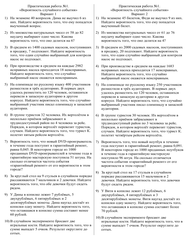 Практическая работа №1. «Вероятность случайного события» Вариант 1 1) На экзамене 40 вопросов. Дима не выучил 6 из них. Найдите вероятность того, что ему попадется выученный вопрос. Практическая работа №1. «Вероятность случайного события» Вариант 2 1) На экзамене 45 билетов, Федя не выучил 9 из них. Найдите вероятность того, что ему попадется выученный билет. 2) Из множества натуральных чисел от 58 до 82 наудачу выбирают одно число. Какова вероятность того, что оно делится на 6? 2) Из множества натуральных чисел от 61 до 76 наудачу выбирают одно число. Какова вероятность того, что оно делится на 4? 3) В среднем из 1400 садовых насосов, поступивших в продажу, 7 подтекают. Найдите вероятность того, что один случайно выбранный для контроля насос не подтекает. 3) В среднем из 2000 садовых насосов, поступивших в продажу, 20 подтекают. Найдите вероятность того, что один случайно выбранный для контроля насос не подтекает. 4) При производстве в среднем на каждые 2982 исправных насоса приходится 18 неисправных. Найдите вероятность того, что случайно выбранный насос окажется неисправным. 4) При производстве в среднем на каждые 1683 исправных насоса приходится 17 неисправных. Найдите вероятность того, что случайно выбранный насос окажется неисправным. 5) На олимпиаде по русскому языку 400 участников разместили в трёх аудиториях. В первых двух удалось разместить по 120 человек, оставшихся перевели в запасную аудиторию в другом корпусе. Найдите вероятность того, что случайно выбранный участник писал олимпиаду в запасной аудитории. 5) На олимпиаде по русскому языку 250 участников разместили в трёх аудиториях. В первых двух удалось разместить по 120 человек, оставшихся перевели в запасную аудиторию в другом корпусе. Найдите вероятность того, что случайно выбранный участник писал олимпиаду в запасной аудитории. 6) В группе туристов 32 человека. Их вертолётом в несколько приёмов забрасывают в труднодоступный район по 4 человека за рейс. Порядок, в котором вертолёт перевозит туристов, случаен. Найдите вероятность того, что турист К. полетит пятым рейсом вертолёта. 6) В группе туристов 30 человек. Их вертолётом в несколько приёмов забрасывают в труднодоступный район по 3 человека за рейс. Порядок, в котором вертолёт перевозит туристов, случаен. Найдите вероятность того, что турист К. полетит четвёртым рейсом вертолёта. 7) Вероятность того, что новый DVD-проигрыватель в течение года поступит в гарантийный ремонт, равна 0,045. В некотором городе из 1000 проданных DVD-проигрывателей в течение года в гарантийную мастерскую поступила 51 штука. На сколько отличается частота события «гарантийный ремонт» от его вероятности в этом городе? 7) Вероятность того, что новый ноутбук в течение года поступит в гарантийный ремонт, равна 0,091. В некотором городе из 1000 проданных ноутбуков в течение года в гарантийную мастерскую поступило 96 штук. На сколько отличается частота события «гарантийный ремонт» от его вероятности в этом городе? 8) За круглый стол на 9 стульев в случайном порядке рассаживаются 7 мальчиков и 2 девочки. Найдите вероятность того, что обе девочки будут сидеть рядом. 9) У Дины в копилке лежит 7 рублёвых, 5 двухрублёвых, 6 пятирублёвых и 2 десятирублёвых монеты. Дина наугад достаёт из копилки одну монету. Найдите вероятность того, что оставшаяся в копилке сумма составит менее 60 рублей. 10) В случайном экс