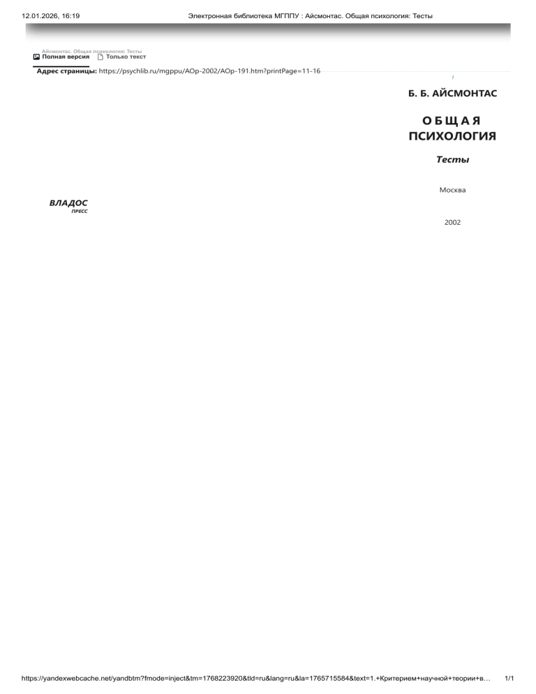 Электронная библиотека МГППУ Айсмонтас. Общая психология Тесты1