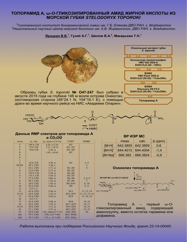 ТОПОРАМИД А, ω-О-ГЛИКОЗИЛИРОВАННЫЙ АМИД ЖИРНОЙ КИСЛОТЫ ИЗ МОРСКОЙ ГУБКИ STELODORYX TOPOROKI 1 Тихоокеанский институт биоорганической химии им. Г.Б. Елякова ДВО РАН, г. Владивосток Национальный научный центр морской биологии им. А.В. Жирмунского, ДВО РАН, г. Владивосток 2 Яроцкая В.В.1, Гузий А.Г.1, Шилов В.А.2, Макарьева Т.Н.1 Этанольный экстракт губки S. toporoki Колоночная хроматография YMC*Gel ODS-A EtOH:H2O (20→100%) ВЭЖХ YMC-Pack ODS-A EtOH:H2O (55:45) / 1%AcONH4 ВЭЖХ Discovery HS F5-5 EtOH:H2O (55:45) / 1%AcONH4 Образец губки S. toporoki № О47-247 был собран в августе 2015 года на глубине 146 м возле острова Онекотан, охотоморская сторона (49°24.1 N, 154°16.1 E), с помощью драги во время научного рейса на НИС «Академик Опарин». Данные ЯМР спектров для топорамида А в CD3OD Атом 1' 2' 3' 4' 5' 6' 1 2 OCH3 3 4 5 6 7 8 9 10 11 12 13-14 15 16 17 18 19-23 24 25 26a 26б dC, тип 104.4, СН 74.9, СН 78.0, СН 82.8, СН 58.5, СН3 34.1, СН2 23.8, СН2 129.9, СН 131.5, СН 27.9, СН2 30.3, СН2 24.6, СН2 43.4, СН2 213.7, С 43.4, СН2 24.9, СН2 43.4, СН2 213.7, С 43.4, СН2 24.6, СН2 30.6, СН2 27.1, СН2 29.9, СН2 70.7, СН2 70.7, СН2 dH, мульт (J в Гц) 4.26, д (7.6) 3.21, т (8.5) 3.38, м 3.45, т (8.4) COSY Н2' H1', H3' H2', H4' H3' HMBC 3.59, м 3.38, с 1.71, м 2.17, м 5.38, м 5.39, м 2.06, м 1.34, м 1.56, м 2.44, м H3 H2, H4 H3, H5 H4, H6 H5, H7 H6, H8 H7, H9 H8, H10 H9 3, 4 2 4 5, 6, 8 7 8, 10 9, 11 2.44, м 1.55, м 2.44, м H13 H12, H15 H14 11, 13, 14 11, 12, 15, 16 13, 14, 16 2.44, м 1.55, м 1.31, м 1.37, м 1.62, квин (J=7.13) 3.94, к (J=7.69) 3.53, к (J=7.69) Н18 Н17, Н19 Н19, Н24 Н23, Н25 Н24, Н26 Н25, Н26б Н25, Н26а 16, 18 16, 17 18, 25 23, 25 26 Топорамид А ВР ИЭР МС - [M-H] [M+H]+ meas calc Δ (ppm) 642.3855 642.3859 0,6 644.4013 644.4004 -1,4 [M+Na]+ 666.383 666.3824 -0,9 Озонолиз топорамида А ВР ИЭР МС m/z 559.3114 [М-Н]- Топорамид А – первый ω-Oгликозилированный амид, содержащий аминогруппу, вместо остатка тирамина или дофамина. Работа выполнена при поддержке Российского Научного Фонда, грант 23-14-00040.