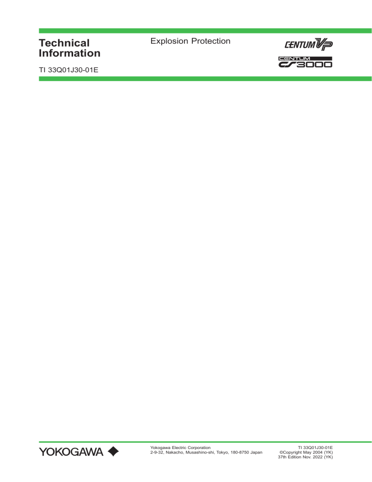 Technical Information Explosion Protection TI 33Q01J30-01E Yokogawa Electric Corporation 2-9-32, Nakacho, Musashino-shi, Tokyo, 180-8750 Japan TI 33Q01J30-01E ©Copyright May 2004 (YK) 37th Edition Nov. 2022 (YK) i Introduction This book describes explosion protection compliance of CENTUM 3000 and CENTUM VP (hereinafter CENTUM.) Some parts of this book will occupy the general explanation about explosion protections, but it mainly explains what explosion protection complied with CENTUM which is an integrated production control system, and what regulation it has. The product explanation after standard maintenance phase start is leave for safety. The engineering practice of explosion protection is regulated by each country, and in principle, the wiring and the other methods for construction should be done in accordance with safety standards. When you implement the explosion protection system on the job, select the products as to comply with the standards of the country in which it is used, and the methods for construction should be researched. Furthermore, this document contains the details of the NFM020-A13, IFM035-A07, NIE008-A101, NIE008-A102, IFM050-A100, NFM035-A100, and NFM036-A101 certificates that are included in the product documentation. All Rights Reserved Copyright © 2004, Yokogawa Electric Corporation TI 33Q01J30-01E May 18, 2018-00 ii Safety Precautions Safety, Protection, and Modification of the Product • In order to protect the system controlled by the product and the product itself and ensure safe operation, observe the safety precautions described in the Technical Information (this book and Installation Guidance) and the User’s Manuals. Yokogawa Electric Corporation ("YOKOGAWA") assume no liability for safety if users fail to observe these instructions when operating the product. • If this product is used in a manner not specified in the Technical Information (this book and Installation Guidance) and the User’s Manuals, the protection provided by this product may be impaired. • If any protection or safety circuit is required for the system controlled by the product or for the product itself, prepare it separately. • Be sure to use the spare parts approved by YOKOGAWA when replacing parts or consumables. • Do not use the accessories (Power supply cord set, etc.) that came with the product for any other products. • Modification of the product is strictly prohibited. • The following symbols are used in the product and instruction manual to indicate that there are precautions for safety: Indicates that caution is required. This symbol for the Product indicates the possibility of dangers such as electric shock on personnel and equipment, and also indicates that the user must refer to the User’s Manuals for necessary actions. In the User’s Manuals, this symbol is used together with a word “CAUTION” or “WARNING” at the locations where precautions for avoiding dangers are described. Indicates that caution is required for hot surface. Note that the devices with this symbol become hot. The risk of burn injury or some damages exists if the devices are touched or contacted. Identifies a protective conductor terminal. Before using the Product, you must ground the protective conductor terminal to avoid electric shock. Identifies a functional grounding terminal. A terminal marked “FG” also has the same function. This terminal is used for grounding other than protective grounding. Before using the Product, you must ground this terminal. Indicates an AC supply. Indicates a DC supply. Indicates the ON state. The state of a power on/off switch and others is indicated. Indicates the OFF state. The state of a power on/off switch and others is indicated. TI 33Q01J30-01E Oct. 5, 2018-00 iii Symbols in this Book This book has the following symbols. WARNING Indicates precautions to avoid a danger that may lead to death or severe injury. CAUTION Indicates precautions to avoid a danger that may lead to minor or moderate injury or property damage. IMPORTANT Identifies important information required to understand the operations or functions. TIP Identifies additional information. SEE ALSO Identifies a source to be referred to. TI 33Q01J30-01E Apr. 21, 2017-00 iv Cautions for Safely Applying the Device Power Supply Wiring WARNING The connection of power cables and the selection of power cables must be done in accordance with this book and the Installation Guidance, and implement so as to comply with the standards and laws about explosion protection in the country or the area where the cables are laid. Ground Wiring WARNING You should implement so as to comply with the standards and laws about explosion protection in the country or the area where the cables are laid. Input/Output Wiring CAUTION The connection of input and output should be done in accordance with this book and the Installation Guidance, and implement so as to comply with the standards and laws about explosion protection in the country or the area where the cables are laid. • Wiring material and equipment which is electrically connected to this equipment should be products that complied with standards and laws about explosion protection in the country or the area where the cables are laid. Replacement of fuse WARNING • The specified fuse must be used as a replacement. • Before replacing fuse, confirm if there’s no dangerous gas, and the power supply is OFF. TI 33Q01J30-01E Jan. 22, 2021-00 v Maintenance CAUTION • The maintenance work should be done only by operators who received special training. • Use a vacuum cleaner and soft cloth to clean up the equipment. • At the time of the maintenance work, put on wrist straps and take the measures for Electrostatic Discharge (ESD). • If the label that indicates Danger is not legible, or if it has peeled off, order a new label using part number T9029BX. • Before starting the maintenance work, confirm if there’s no dangerous gas. • The mainte
