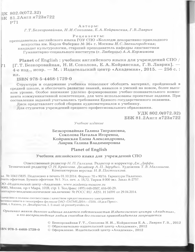 P la n e t o f English : учебник английского язы ка для учреждений СПО /