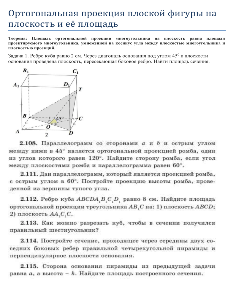 Ортогональная проекция плоскои фигуры на плоскость и ее площадь Теорема: Площадь ортогональной проекции многоугольника на плоскость равна площади проектируемого многоугольника, умноженной на косинус угла между плоскостью многоугольника и плоскостью проекций. Задача 1. Ребро куба равно 2 см. Через диагональ основания под углом 450 к плоскости основания проведена плоскость, пересекающая боковое ребро. Найти площадь сечения.