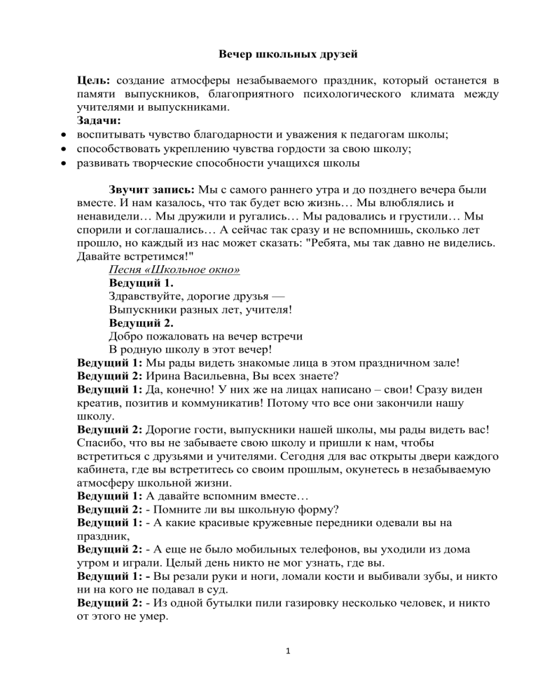 Вечер школьных друзей Цель: создание атмосферы незабываемого праздник, который останется в памяти выпускников, благоприятного психологического климата между учителями и выпускниками. Задачи: воспитывать чувство благодарности и уважения к педагогам школы; способствовать укреплению чувства гордости за свою школу; развивать творческие способности учащихся школы Звучит запись: Мы с самого раннего утра и до позднего вечера были вместе. И нам казалось, что так будет всю жизнь… Мы влюблялись и ненавидели… Мы дружили и ругались… Мы радовались и грустили… Мы спорили и соглашались… А сейчас так сразу и не вспомнишь, сколько лет прошло, но каждый из нас может сказать: "Ребята, мы так давно не виделись. Давайте встретимся!" Песня «Школьное окно» Ведущий 1. Здравствуйте, дорогие друзья — Выпускники разных лет, учителя! Ведущий 2. Добро пожаловать на вечер встречи В родную школу в этот вечер! Ведущий 1: Мы рады видеть знакомые лица в этом праздничном зале! Ведущий 2: Ирина Васильевна, Вы всех знаете? Ведущий 1: Да, конечно! У них же на лицах написано – свои! Сразу виден креатив, позитив и коммуникатив! Потому что все они закончили нашу школу. Ведущий 2: Дорогие гости, выпускники нашей школы, мы рады видеть вас! Спасибо, что вы не забываете свою школу и пришли к нам, чтобы встретиться с друзьями и учителями. Сегодня для вас открыты двери каждого кабинета, где вы встретитесь со своим прошлым, окунетесь в незабываемую атмосферу школьной жизни. Ведущий 1: А давайте вспомним вместе… Ведущий 2: - Помните ли вы школьную форму? Ведущий 1: - А какие красивые кружевные передники одевали вы на праздник, Ведущий 2: - А еще не было мобильных телефонов, вы уходили из дома утром и играли. Целый день никто не мог узнать, где вы. Ведущий 1: - Вы резали руки и ноги, ломали кости и выбивали зубы, и никто ни на кого не подавал в суд. Ведущий 2: - Из одной бутылки пили газировку несколько человек, и никто от этого не умер. 1 Ведущий 1: - У вас не было игровых приставок, компьютеров, 165-ти каналов спутникового телевидения, компакт дисков, сотовых телефонов, интернета, вы неслись смотреть мультфильм всей толпой в ближайший дом, ведь видиков тоже не было! Ведущий 2: Вы катались на великах, пускали спички по весенним ручьям, сидели на лавочке, на заборе или в школьном дворе и болтали, о чем хотели. Ведущий 1: А сейчас… - все пользуются сотовой связью, и вы тоже Ведущий 2: - вы отправляете e-mail своему коллеге, что сидит в соседней комнате - вы впадаете в состояние паники, если выйдете из дома без мобильного телефона и сразу возвращаетесь за ним Ведущий 1: - проснувшись утром первую вещь, которую вы делаете подсоединяетесь к Интернет. - ваша жизнь немыслима без микроволновок. Ведущий 2: Но вы всё равно вспоминаете свое детство, как самое лучшее и беззаботное время своей жизни. Ведущий 1: Детство - это сказочная страна, и всем известно, что оно неразрывно связано со школой. Песня «Детки-конфетки» Ведущий 2: Сегодня в зале нашей школы собрались те, кто решил прикоснуться к воспоминаниям о школе, пришли ученики разных лет. Молодые и не очень, в прошлом примерные, а порой и неуправляемые... Внимание! К перекличке поколений приготовиться! Просим отозваться кодовыми фразами! Ведущий 1: Выпускники 1979 года, и ваше приветствие – Да здравствует школа! Выпускники отвечают Ведущий 2: Выпускники 1984 года, и ваше приветствие –