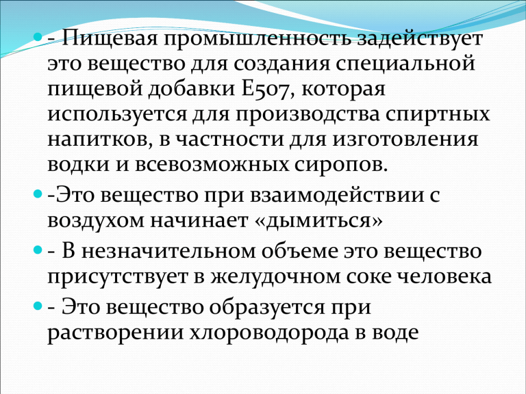 - Пищевая промышленность задействует это вещество для создания специальной пищевой добавки Е507, которая используется для производства спиртных напитков, в частности для изготовления водки и всевозможных сиропов. -Это вещество при взаимодействии с воздухом начинает «дымиться» - В незначительном объеме это вещество присутствует в желудочном соке человека - Это вещество образуется при растворении хлороводорода в воде НЕМНОГО ИСТОРИИ Известно, что уже в конце XV в. алхимик Василий Валентин и в XVI в. Андреас Либавий в усердных поисках чудодейственного жизненного эликсира прокаливали в своих странных для нас алхимических приборах поваренную соль с квасцами и купоросами и получили продукт, который описали под названием «кислого спирта». Это и была знакомая теперь нам кислота, конечно, очень нечистая. Для первых исследователей это было совершенно новое вещество, обладавшее свойствами, которые сильно поражали их воображение. Нюхая его, они задыхались и кашляли, «кислый спирт» дымил в воздухе. При пробование на вкус, он обжигал язык и нёбо, металлы он разъедал, ткани разрушал. Строение молекулы Физические свойства Получение Химические свойства Применение Физические свойства Соля́ная кислота́ (также хлороводоро́дная, хлористоводоро́дная кислота, хлористый водород) — раствор хлороводорода (HCl) в воде, сильная одноосновная кислота. Бесцветная, прозрачная, едкая жидкость, «дымящаяся» на воздухе (техническая соляная кислота — желтоватого цвета из-за примесей железа, хлора и пр.). Химические свойства • Изменение окраски индикаторов • Взаимодействие с металлами Zn + HCl – • Взаимодействие с основными и амфотерными оксидами CaO + HCl • Взаимодействие с основаниями Сu(OH)2 + HCl • Взаимодействие с cолями K2CO3 + HCl - Специфические свойства Качественной реакцией на соляную кислоту и её соли является её взаимодействие с нитратом серебра, при котором образуется творожистый осадок хлорида серебра, нерастворимый в азотной кислоте Это интересно Немногие знают о том, что для улучшения и модернизации многих процессов в строительстве используется соляная кислота. Ее добавляют в бетон для повышения его морозостойкости. К тому же, состав намного быстрее застывает, а кладка приобретает устойчивость к влаге. Еще кислоту используют в качестве окислителя от известняка. ХЛОРИДЫ – соли соляной кислоты