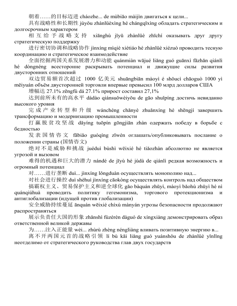 朝着……的目标迈进 cháozhe... de mùbiāo màijìn двигаться к цели... 具有战略性和长期性 jùyǒu zhànlüèxìng hé chángqīxìng обладать стратегическим и долгосрочным характером 相 互 给 予 战 略 支 持 xiānghù jǐyǔ zhànlüè zhīchí оказывать друг другу стратегическую поддержку 进行密切协调和战略协作 jìnxíng mìqiè xiétiáo hé zhànlüè xiézuò проводить тесную координацию и стратегическое взаимодействие 全面挖掘两国关系发展潜力和动能 quánmiàn wājué liǎng guó guānxì fāzhǎn qiánlì hé dòngnéng всесторонне раскрывать потенциал и движущие силы развития двусторонних отношений 双边贸易额首次超过 1000 亿美元 shuāngbiān màoyì é shǒucì chāoguò 1000 yì měiyuán объём двусторонней торговли впервые превысил 100 млрд долларов США 增幅达 27.1% zēngfú dá 27.1% прирост составил 27,1% 达到前所未有的高水平 dádào qiánsuǒwèiyǒu de gāo shuǐpíng достичь невиданно высокого уровня 完 成 产 业 转 型 和 升 级 wánchéng chǎnyè zhuǎnxíng hé shēngjí завершить трансформацию и модернизацию промышленности 打 赢 脱 贫 攻 坚 战 dǎyíng tuōpín gōngjiān zhàn одержать победу в борьбе с бедностью 发 表 国 情 咨 文 fābiǎo guóqíng zīwén оглашать/опубликовывать послание о положении страны (国情咨文) 绝 对 不 是 威 胁 和 挑 战 juéduì bùshì wēixié hé tiǎozhàn абсолютно не является угрозой и вызовом 难得的机遇和巨大的潜力 nándé de jīyù hé jùdà de qiánlì редкая возможность и огромный потенциал 对……进行垄断 duì... jìnxíng lǒngduàn осуществлять монополию над... 对社会进行操控 duì shèhuì jìnxíng cāokòng осуществлять контроль над обществом 搞霸权主义、贸易保护主义和逆全球化 gǎo bàquán zhǔyì, màoyì bǎohù zhǔyì hé nì quánqiúhuà проводить политику гегемонизма, торгового протекционизма и антиглобализации (идущей против глобализации) 安全威胁持续蔓延 ānquán wēixié chíxù mànyán угрозы безопасности продолжают распространяться 展示负责任大国的形象 zhǎnshì fùzérèn dàguó de xíngxiàng демонстрировать образ ответственной великой державы 为……注入正能量 wèi... zhùrù zhèng néngliàng вливать позитивную энергию в... 离 不 开 两 国 元 首 的 战 略 引 领 lí bù kāi liǎng guó yuánshǒu de zhànlüè yǐnlǐng неотделимо от стратегического руководства глав двух государств Посол Китая в России Чжан Ханьхуэй опубликовал статью под названием: «Смело нести новую миссию, поддерживая новую эпоху» В июне этого года председатель Си Цзиньпин и президент Путин объявили о повышении отношений между двумя странами до уровня «партнерства всестороннего стратегического сотрудничества новой эпохи». Это означает, что китайско-российские отношения вступили в стадию значительного развития на более высоком уровне, продвигаясь к цели «взаимной помощи, глубокой интеграции, инновационному развитию и всеобъемлющему выигрышу». Укрепление китайско-российских отношений отвечает требованиям времени, является непоколебимым стратегическим выбором обеих сторон и соответствует общим ожиданиям международного сообщества. Новая эпоха придаёт новые значения. Китайско-российские отношения вступают в новую эпоху, открывая новые возможности для развития, их содержание становится более богатым, практичным, стратегическим и долгосрочным. Во-первых, необходимо взаимопомощь, предоставление друг другу более крепкой и эффективной стратегической поддержки, поддержка друг друга в выборе собственного пути развития и защите национальных интересов, обеспечение суверенитета, безопасности и территориальной целостности обеих стран. Во-вторых, необходимо углублённое сотрудничество, тесная координация и стратегическое сотрудничество по вопросам национальных стратегий развития, расширение взаимовыгодного сотрудничества в торговле и 
