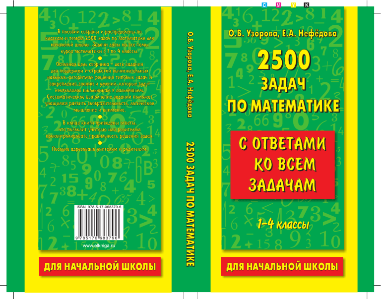 Основная цель сборника - дать задания для поддержки и отработки вычислительных навыков, алгоритмов решения типовых задач и закрепления знаний и умений, которые будут необходимы школьникам в дальнейшем. Систематическое выполнение заданий поможет учащимся развить сообразительность, логическое мышление и внимание. О.В. Узорова, Е.А. Нефёдова В пособии собраны и распределены по классам и темам 2500 задач по математике для начальной школы. Задачи даны на все темы курса математики с 1 по 4 классы. В конце книги приведены ответы, что позволит учителю или родителям проконтролировать правильность решения задач. ДЛЯ НАЧАЛЬНОЙ ШКОЛЫ 2500 ЗАДАЧ ПО МАТЕМАТИКЕ Пособие адресовано учителям и родителям. О.В. Узорова, Е.А. Нефёдова 2500 ЗАДАЧ ПО МАТЕМАТИКЕ C ОТВЕТАМИ КО ВСЕМ ЗАДАЧАМ 1-4 классы ДЛЯ НАЧАЛЬНОЙ ШКОЛЫ О.В. Узорова, Е.А. Нефёдова 2500 ЗАДАЧ ПО МАТЕМАТИКЕ С ОТВЕТАМИ КО ВСЕМ ЗАДАЧАМ 1–4 классы АСТ•Астрель Москва УДК 373:51 ББК 22.1я71 У34 У34 Узорова, О.В. 2500 задач по математике с ответами ко всем задачам : 14й кл. : / О.В. Узорова, Е.А. Нефёдова. — М.: АСТ: Астрель, 2010. – 254,[2] с. ISBN 9785170683796 (ООО «Издательство АСТ») ISBN 9785271289811 (ООО «Издательство Астрель») В данном пособии представлен материал для учащихся 14 клас сов по математике. Путём регулярных упражнений учащиеся усвоят навыки устных и письменных вычислений и научатся решать задачи, которые входят в программу начальной школы. Пособие содержит материал, направленный на формирование математических знаний, умений и навыков. Оно полезно всем школьникам в качестве дополнительного материала по математике. В конце книги приведены ответы, что позволит учителю или родителям проконтролировать правильность решения задач. Пособие можно использовать для коллективной и индивиду альной работы в классе или дома. УДК 373:51 ББК 22.1я71 Подписано в печать 28.06.2010. Формат 84x108 1/32 Усл. печ. л. 13,44. Тираж экз. Заказ № ISBN 9785170683796 (ООО «Издательство АСТ») ISBN 9785271289811 (ООО «Издательство Астрель») © Узорова О.В., Нефёдова Е.А. © ООО «Издательство Астрель» 2 Содержание Предисловие ......................................................... 6 12 классы Задачи на нахождение суммы ............................... 7 Задачи на увеличение и уменьшение числа на несколько единиц ................................... 12 Задачи на нахождение неизвестного слагаемого ............................................................ 16 Задачи на нахождение остатка .............................. 20 Задачи на нахождение неизвестного вычитаемого и слагаемого .................................... 21 Задачи на нахождение уменьшаемого .................. 25 Задачи на разностное сравнение .......................... 29 Задачи с косвенными вопросами .......................... 31 Зачёт 1 ................................................................ 34 Составные задачи на нахождение суммы .............. 39 Составные задачи на нахождение остатка ............. 45 Составные задачи на нахождение слагаемого и вычитаемого .................................... 48 Составные задачи на нахождение третьего слагаемого ............................................. 53 Составные задачи на нахождение суммы .............. 56 Составные задачи на нахождение уменьшаемого ....................................................... 60 Составные задачи на разностное сравнение .................................. 62 Зачёт 2 ................................................................ 66 3 класс Простые задачи на умножение .............................. 73 Задачи на увеличение и уменьшение числа в несколько раз ........................................... 75 Задачи на деление по содержанию и на равные части .................................................. 78 3 Задачи на кратное с