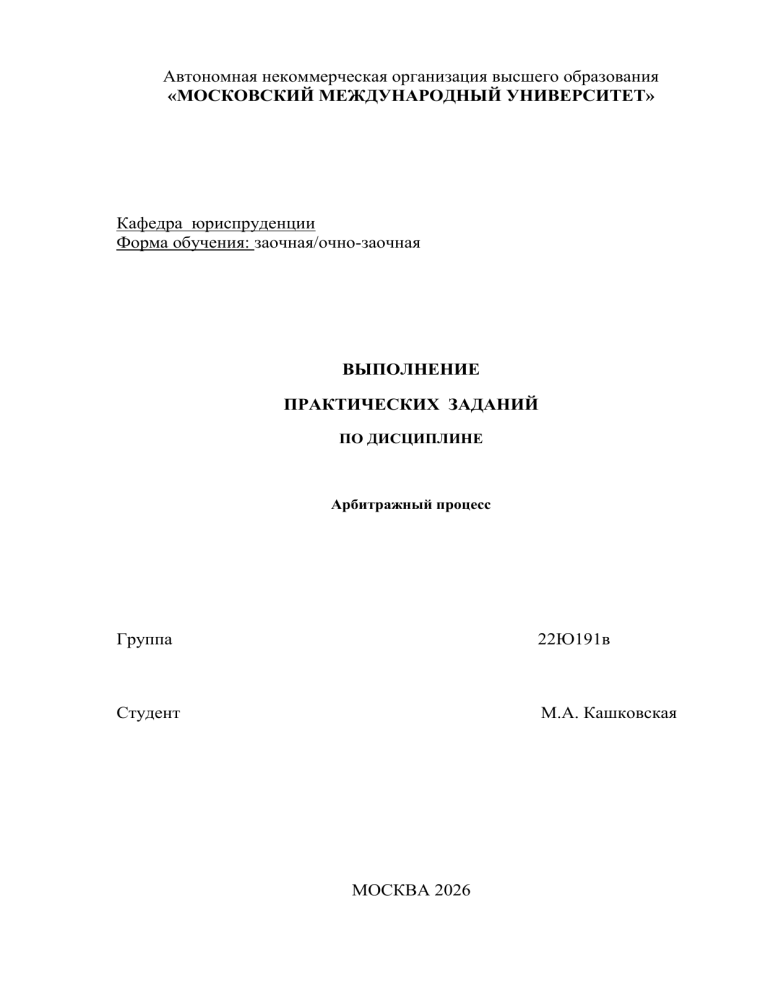 Автономная некоммерческая организация высшего образования «МОСКОВСКИЙ МЕЖДУНАРОДНЫЙ УНИВЕРСИТЕТ» Кафедра юриспруденции Форма обучения: заочная/очно-заочная ВЫПОЛНЕНИЕ ПРАКТИЧЕСКИХ ЗАДАНИЙ ПО ДИСЦИПЛИНЕ Арбитражный процесс Группа 22Ю191в Студент М.А. Кашковская МОСКВА 2026 Задание 1. Каким образом следует поступить председательствующему в заседании в случае, когда арбитражный заседатель не может по болезни длительное время участвовать в арбитражном процессе? Ответ: В случае председательствующим в заседании может быть вынесено определение о замене арбитражного заседателя с предложением стороне, по заявлению которой был привлечен арбитражный заседатель, выбрать другую кандидатуру. Если сторона кандидатуру другого арбитражного заседателя не выбрала, председательствующий вправе самостоятельно определить кандидатуру арбитражного заседателя. Задание 2. Рассмотрите на примерах судебной практики (самостоятельно подобранных студентами) действие принципов арбитражного процесса: - осуществления правосудия только судом; - независимости судей и подчинения их только Конституции Российской Федерации и федеральному закону; - законности; - диспозитивности; - состязательности; - равноправия сторон; - непосредственности Ответ: 1. Принцип осуществления правосудия только судом представляет собой такое правило, по которому реализация полномочий, отнесенных к ведению органов судебной власти, может осуществляться только судами, созданными в соответствии с законом. Данный принцип характеризует место органов судебной власти в обобщенном системе разделения виде) властей, когда органы законодательной (в наиболее власти должны принимать нормативные акты, органы исполнительной власти обеспечивают их практическую реализацию, а органы судебной власти разрешают конфликты. Применительно к арбитражному процессуальному праву данный принцип закрепляет, что по делам в сфере хозяйственной юрисдикции, отнесенным к ведению арбитражных судов, только арбитражный суд вправе осуществлять правосудие. В соответствии со смыслом ст. 118 Конституции РФ и ст. 1 Федерального конституционного закона «О судебной системе Российской Федерации» судебная власть в России в сфере хозяйственной юрисдикции (по делам, отнесенным к ведению арбитражных судов) может осуществляться только арбитражными судами в лице арбитражных судей и привлекаемых в установленном законом порядке к осуществлению правосудия арбитражных заседателей. Никакие другие органы и лица не вправе принимать на себя осуществление правосудия. Не допускается создание каких-либо чрезвычайных судов. Судебная власть самостоятельна и осуществляется независимо от законодательной и исполнительной властей. Тем самым законодатель обеспечивает специализацию каждого из государственных и судебных органов на решении определенного круга вопросов, не допуская пересечение их компетенции. 2. Принцип независимости судей и подчинения их только Конституции РФ и федеральному закону представляет собой такое правило, согласно которому судьи при осуществлении правосудия принимают судебные акты без влияния каких-либо других органов и лиц и основываясь только на нормативных актах определенного уровня. Данный принцип сочетает в себе одновременно два начала: независимость судей, которая в то же время о