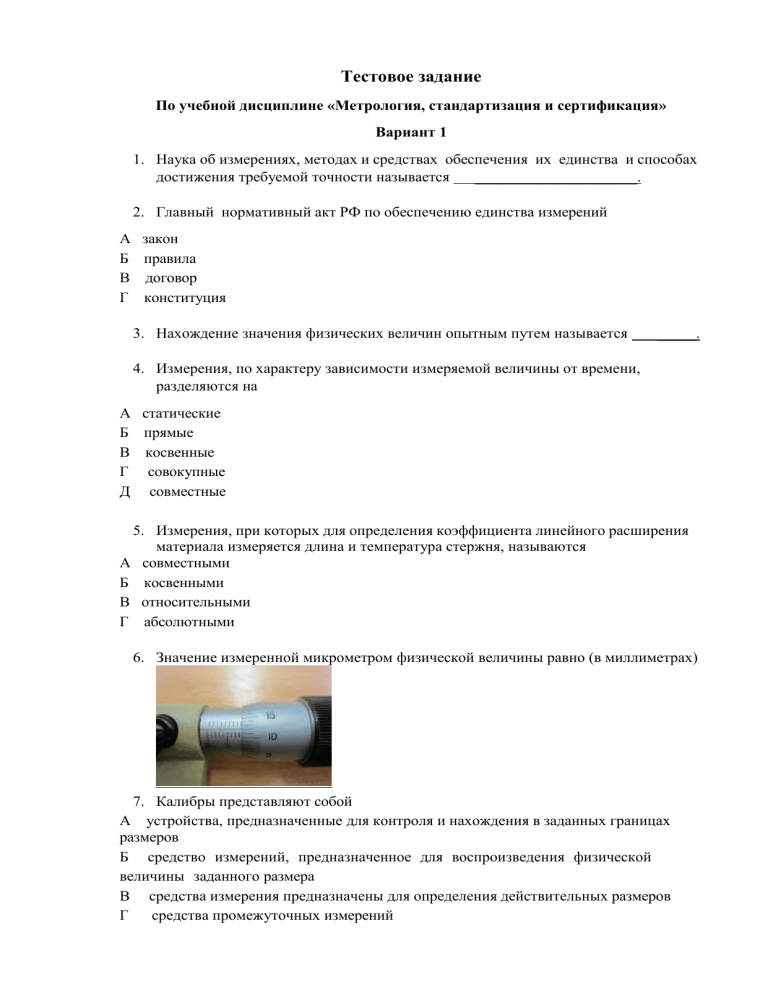 Тестовое задание По учебной дисциплине «Метрология, стандартизация и сертификация» Вариант 1 1. Наука об измерениях, методах и средствах обеспечения их единства и способах достижения требуемой точности называется _____________________. 2. Главный нормативный акт РФ по обеспечению единства измерений А Б В Г закон правила договор конституция 3. Нахождение значения физических величин опытным путем называется _____. 4. Измерения, по характеру зависимости измеряемой величины от времени, разделяются на А статические Б прямые В косвенные Г совокупные Д совместные 5. Измерения, при которых для определения коэффициента линейного расширения материала измеряется длина и температура стержня, называются А совместными Б косвенными В относительными Г абсолютными 6. Значение измеренной микрометром физической величины равно (в миллиметрах) 7. Калибры представляют собой А устройства, предназначенные для контроля и нахождения в заданных границах размеров Б средство измерений, предназначенное для воспроизведения физической величины заданного размера В средства измерения предназначены для определения действительных размеров Г средства промежуточных измерений 8. Название измерительного инструмента по изображению А Б В 9. Аббревиатура международной организации по стандартизации - _____. 10. Деятельность по установлению правил и характеристик в целях их добровольного многократного использования, направленная на достижение упорядоченности в сферах производств и обращения продукции А стандартизация Б техническое регулирование В оценка соответствия Г сертификация 11. Стандарт, утвержденный министерством Российской Федерации А ОСТ Б РСТ В ГОСТ Г СТП 12. При условии, если верхнее отклонение отверстия +21 мкм, верхнее отклонение вала +41 мкм, нижнее отклонение вала +28 мкм, допуск посадки ∅30𝐻7/𝑟6 будет равен _____ мкм. 13. Допуск размера вала при es = 25 мкм. и ei = - 10 мкм. будет равен А 35 мкм Б 15 мкм В 25 мкм Г -10 мкм 14. Посадка ∅30Н7/к6 выполнена в системе А отверстия Б вала В вне системы Г сборки 15. Базой при назначении допусков, приведенных на рисунке, является А общая ось поверхностей Г и Д Б поверхности отверстий Г и Д В ось поверхности Д Г ось поверхности Г 16. LH в обозначении М20x1 LH - 5Н означает А левая резьба Б длину свинчивания В поле допуска на приведенный средний диаметр Г поле допуска на наружный диаметр 17. К допускам формы относится допуск А круглости Б формы заданного профиля В соосности Г торцового биения 18. Укажите вид допусков расположения А Б В 19. Метод оценки качества, основанный на сборе и учете мнений потребителей продукции, называется А социологический Б органолептический В инструментальный Г визуальный 20. Экспериментальное определение значений параметров и показателей качества продукции А испытание Б прогнозирование В оценка Г сборка 21. Продукция или ее часть, или проба, непосредственно подвергаемые эксперименту при испытаниях, называется А образцом для испытаний Б моделью для испытаний В системой испытаний Г продукцией испытаний 22. Действие, удостоверяющее соответствие определенному стандарту или другому нормативному документу, называется _____________ соответствия. 23. Деятельность по сертификации в РФ основана на законе РФ А "О сертификации продукции и услуг" Б "О техническом регулировании" В "О защите прав потребителей" Г "Об обеспечении единства измерени