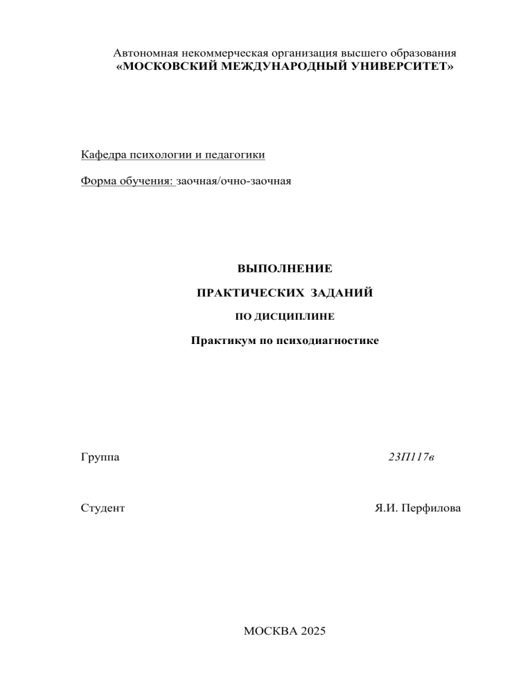 Автономная некоммерческая организация высшего образования «МОСКОВСКИЙ МЕЖДУНАРОДНЫЙ УНИВЕРСИТЕТ» Кафедра психологии и педагогики Форма обучения: заочная/очно-заочная ВЫПОЛНЕНИЕ ПРАКТИЧЕСКИХ ЗАДАНИЙ ПО ДИСЦИПЛИНЕ Практикум по психодиагностике Группа 23П117в Студент Я.И. Перфилова МОСКВА 2025 Практическое задание по теме 1 «Введение в практикум по психодиагностике» Задания для самостоятельной работы Задание 2. Тестирование как метод психологического исследования. Дайте общую характеристику метода тестов. Опишите достоинства и недостатки метода тестов. Тестирование как метод психологического исследования Тестирование — один из самых распространённых и научно обоснованных методов психологического исследования. Суть метода заключается в стандартизированной процедуре предъявления заданий (тестовых заданий) и объективной оценке результатов для выявления психологических характеристик человека: интеллекта, личности, способностей, эмоциональных и других особенностей. Общая характеристика метода тестов Психологический тест — это стандартизированный предназначенных для количественной и/или набор заданий, качественной оценки определённых психических свойств, состояний или процессов. Тестирование может проводиться индивидуально или в группе, письменно, устно или с помощью компьютера. Результаты оцениваются по заранее установленным шкалам. Основные черты метода тестирования: Стандартизация: все участники выполняют одинаковые задания в одинаковых условиях. Объективность: минимальное влияние субъективных факторов при интерпретации результатов. Надёжность: стабильность результатов при повторных измерениях. Валидность: тест действительно измеряет ту характеристику, для которой предназначен. Достоинства метода тестов Объективность результатов — чёткие критерии оценки. Стандартизация — возможность сравнивать результаты разных людей. Экономичность — можно быстро проверить большое количество людей. Универсальность — тесты применимы для диагностики разных психических свойств: интеллекта, памяти, темперамента и др. Возможность статистической обработки — анализ больших выборок, выявление закономерностей. Недостатки метода тестов Ограниченность информации — тесты, как правило, измеряют только те параметры, которые заложены в их структуру. Влияние внешних факторов — усталость, волнение, плохое самочувствие могут исказить результаты. Культурная и языковая обусловленность — один и тот же тест может по-разному работать в разных культурах. Возможность случайных ответов — человек может угадывать или намеренно искажать свои ответы. Проблема "натаскивания" — если человек часто проходит тесты, он может научиться лучше их выполнять без реального изменения измеряемых качеств. Вывод Метод тестирования — мощный инструмент психолога, но его результаты требуют аккуратной интерпретации и, по возможности, подтверждения другими методами (беседа, наблюдение и др.). Практическое задание по теме 2 «Диагностика психофизиологических особенностей» Задания для самостоятельной работы Задание исследований 1. Опишите основные методы психофизиологических (регистрация импульсной активности нервных клеток, окулография, электромиография и др.) Основные методы психофизиологических исследований 1. Регистрация импульсной 