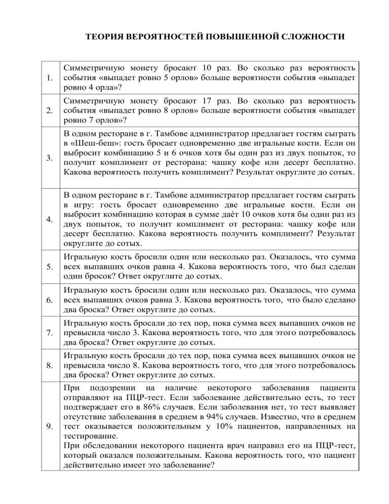 ТЕОРИЯ ВЕРОЯТНОСТЕЙ ПОВЫШЕННОЙ СЛОЖНОСТИ 1. Симметричную монету бросают 10 раз. Во сколько раз вероятность события «выпадет ровно 5 орлов» больше вероятности события «выпадет ровно 4 орла»? 2. Симметричную монету бросают 17 раз. Во сколько раз вероятность события «выпадет ровно 8 орлов» больше вероятности события «выпадет ровно 7 орлов»? 3. В одном ресторане в г. Тамбове администратор предлагает гостям сыграть в «Шеш-беш»: гость бросает одновременно две игральные кости. Если он выбросит комбинацию 5 и 6 очков хотя бы один раз из двух попыток, то получит комплимент от ресторана: чашку кофе или десерт бесплатно. Какова вероятность получить комплимент? Результат округлите до сотых. 4. В одном ресторане в г. Тамбове администратор предлагает гостям сыграть в игру: гость бросает одновременно две игральные кости. Если он выбросит комбинацию которая в сумме даѐт 10 очков хотя бы один раз из двух попыток, то получит комплимент от ресторана: чашку кофе или десерт бесплатно. Какова вероятность получить комплимент? Результат округлите до сотых. 5. Игральную кость бросили один или несколько раз. Оказалось, что сумма всех выпавших очков равна 4. Какова вероятность того, что был сделан один бросок? Ответ округлите до сотых. 6. Игральную кость бросили один или несколько раз. Оказалось, что сумма всех выпавших очков равна 3. Какова вероятность того, что было сделано два броска? Ответ округлите до сотых. 7. Игральную кость бросали до тех пор, пока сумма всех выпавших очков не превысила число 3. Какова вероятность того, что для этого потребовалось два броска? Ответ округлите до сотых. 8. Игральную кость бросали до тех пор, пока сумма всех выпавших очков не превысила число 8. Какова вероятность того, что для этого потребовалось два броска? Ответ округлите до сотых. 9. При подозрении на наличие некоторого заболевания пациента отправляют на ПЦР-тест. Если заболевание действительно есть, то тест подтверждает его в 86% случаев. Если заболевания нет, то тест выявляет отсутствие заболевания в среднем в 94% случаев. Известно, что в среднем тест оказывается положительным у 10% пациентов, направленных на тестирование. При обследовании некоторого пациента врач направил его на ПЦР-тест, который оказался положительным. Какова вероятность того, что пациент действительно имеет это заболевание? При подозрении на наличие некоторого заболевания пациента отправляют на ПЦР-тест. Если заболевание действительно есть, то тест подтверждает его в 91% случаев. Если заболевания нет, то тест выявляет отсутствие заболевания в среднем в 93% случаев. Известно, что в среднем тест 10. оказывается положительным у 13% пациентов, направленных на тестирование. При обследовании некоторого пациента врач направил его на ПЦР-тест, который оказался положительным. Какова вероятность того, что пациент действительно имеет это заболевание? Стрелок в тире стреляет по мишени до тех пор, пока не поразит еѐ. Известно, что он попадает в цель с вероятностью 0,2 при каждом отдельном 11. выстреле. Сколько патронов нужно дать стрелку, чтобы он поразил цель с вероятностью не менее 0,6? Стрелок в тире стреляет по мишени до тех пор, пока не поразит еѐ. Известно, что он попадает в цель с вероятностью 0,7 при каждом отдельном 12. выстреле. Сколько патронов нужно дать стрелку, чтобы он поразил цель с вероятностью не менее 0,95? Стрелок стрел