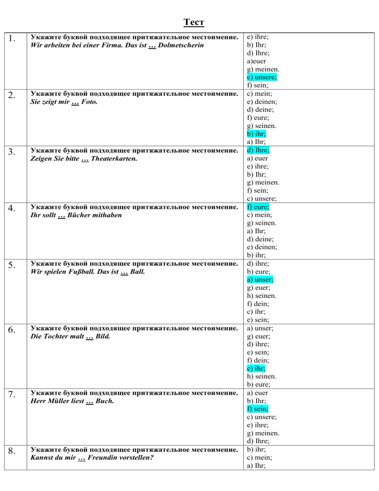 Тест 1. Укажите буквой подходящее притяжательное местоимение. Wir arbeiten bei einer Firma. Das ist … Dolmetscherin 2. Укажите буквой подходящее притяжательное местоимение. Sie zeigt mir … Foto. 3. Укажите буквой подходящее притяжательное местоимение. Zeigen Sie bitte … Theaterkarten. 4. Укажите буквой подходящее притяжательное местоимение. Ihr sollt … Bücher mithaben 5. Укажите буквой подходящее притяжательное местоимение. Wir spielen Fußball. Das ist … Ball. 6. Укажите буквой подходящее притяжательное местоимение. Die Tochter malt … Bild. 7. Укажите буквой подходящее притяжательное местоимение. Herr Müller liest … Buch. 8. Укажите буквой подходящее притяжательное местоимение. Kannst du mir … Freundin vorstellen? e) ihre; b) Ihr; d) Ihre; a)euer g) meinen. c) unsere; f) sein; c) mein; e) deinen; d) deine; f) eure; g) seinen. b) ihr; a) Ihr; d) Ihre; a) euer e) ihre; b) Ihr; g) meinen. f) sein; c) unsere; f) eure; c) mein; g) seinen. a) Ihr; d) deine; e) deinen; b) ihr; d) ihre; b) eure; a) unser; g) euer; h) seinen. f) dein; c) ihr; e) sein; a) unser; g) euer; d) ihre; e) sein; f) dein; c) ihr; h) seinen. b) eure; a) euer b) Ihr; f) sein; c) unsere; e) ihre; g) meinen. d) Ihre; b) ihr; c) mein; a) Ihr; 9. Укажите буквой подходящее притяжательное местоимение. Die Dolmetscherin ist hier. Da liegt … Tasche. 10. Укажите буквой подходящее притяжательное местоимение. Das Kind nimmt … Spielzeug. 11. Укажите буквой подходящее притяжательное местоимение. Ich nehme … Buch. 12. Укажите буквой подходящее притяжательное местоимение. Die Firma produziert verschiedene Geräte. … Vertreter führt Verhandlungen über den Verkauf dieser Geräte. 13. Укажите буквой подходящее притяжательное местоимение. Habt ihr … Prospekte mitgebracht? 14. Укажите вспомогательный глагол. Wie lange … du dort geblieben? Укажите вспомогательный глагол. Ich … mich für das Foto interessiert. Укажите вспомогательный глагол. Die Studenten … dieses grammatische Thema gut verstanden. Укажите вспомогательный глагол. Wir … das nicht gewußt. Укажите вспомогательный глагол. Er … uns viel Interessantes erzählt. Укажите вспомогательный глагол. Ihr Vertreter … schon gekommen. Укажите вспомогательный глагол. Ich … ein Telegramm geschickt. 15. 16. 17. 18. 19. 20. d) deine; f) eure; g) seinen. e) deinen; g) meinen. e) ihre; f) sein; d) Ihre; a) euer c) unsere; b) Ihr; a) unser; d) ihre; h) seinen. f) dein; c) ihr; e) sein; g) euer; b) eure; b) ihr; a) Ihr; f) eure; e) deinen; g) seinen. d) deine; c) mein; d) ihre e) sein; h) seinen. c) ihr; f) dein; g) euer; b) eure; a) unser; h) seinen. a) unser; d) ihre f) dein; g) euer; e) sein; c) ihr; b) eure; b) sein; a) haben; b) sein; a) haben; b) sein; a) haben; b) sein; a) haben; b) sein; a) haben; b) sein; a) haben; b) sein; a) haben; 21. 22. 23. 24. 25. 26. 27. 28. 29. Укажите вспомогательный глагол. Wo … er geblieben? Укажите вспомогательный глагол. Ich … mich mit kaltem Wasser gewaschen. Укажите вспомогательный глагол. Er … mich seinem Freund vorgestellt. Укажите вспомогательный глагол. Heute … ich sehr früh aufgestanden. Укажите вспомогательный глагол. Die Freunde … ihre Ferien gut verbracht. Укажите вспомогательный глагол. Der Tourist … sich für die Sehenswürdigkeiten der Stadt interessiert. Укажите вспомогательный глагол. Ich … dort zwei Wochen geblieben. Укажите вспомогательный глагол. Im vorigen Jahr … ich nach Deutschland gefahren. Укажите глагол в Imperfekt в соответственном лице и числе. Wohin … Sie gestern? 30. Укажите глагол в Imperfekt в соответственном лице и числе. Die Partner … ihre Probleme. 31. Укажите глагол в Imperfekt в соответственном лице и числе. Gestern … unser Chef im Werk. 32. Укажите глагол в Imperfekt в соответственном лице и числе. Herr Müller … für die Lieferung zuständig. 33. Укажите глагол в Imperfekt в соответственном лице и числе. Er … ins Kauhaus. 34. Укажите глагол в Imperfekt в соответственном лице и числе. Wieviel € … der Preis für diese Maschinen? 35. Укажите глагол в Imperfekt в соответственном лице и числе. Er … die Ferien bei seinem Freund. 36. Укажите глагол в Imperfekt в соответственном лице и числе. Wann … er Verhandlungen? 37. Укажите глагол в Imperfekt в соответственном лице и числе. Wir … ihnen unsere Geräte … 38. Укажите глагол в Imperfekt в соответственном лице и числе. Wieviel Jahre … dieses Unternehmen. b) sein; a) haben; b) sein; a) haben; b) sein; a) haben; b) sein; a) haben; b) sein; a) haben; a) haben; b) sein; a) haben; b) se