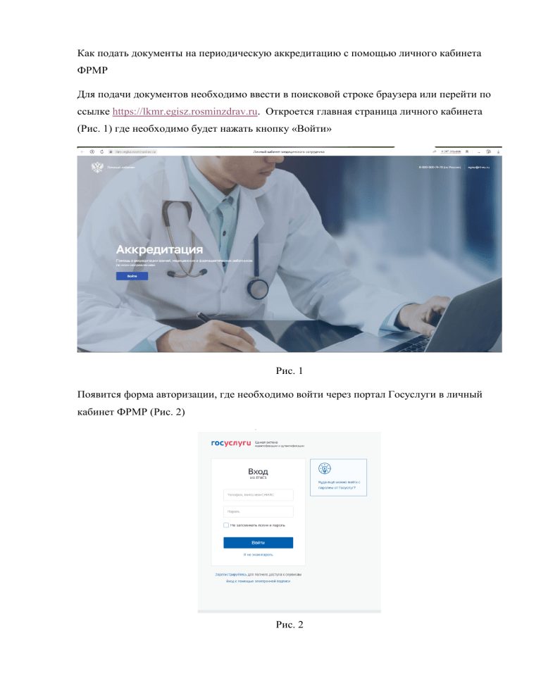 Как подать документы на периодическую аккредитацию с помощью личного кабинета ФРМР Для подачи документов необходимо ввести в поисковой строке браузера или перейти по ссылке https://lkmr.egisz.rosminzdrav.ru. Откроется главная страница личного кабинета (Рис. 1) где необходимо будет нажать кнопку «Войти» Рис. 1 Появится форма авторизации, где необходимо войти через портал Госуслуги в личный кабинет ФРМР (Рис. 2) Рис. 2 В данном личном кабинете все персональные данные подтянутся автоматически. Необходимо заполнить поля контактный телефон и электронную почту. ФАЦ направляет на них все необходимые уведомления по рассмотрению заявления на периодическую аккредитацию Рис. 3 Далее необходимо выбрать «Уровень образования» и специальность, по которой аккредитуемый подает документы (Рис. 4 и Рис. 5) Для лиц, имеющих только специальность специалитета и не проходивших программы интернатуры/ординатуры профессиональной переподготовки – выбирается «Уровень образования» Высшее-специалитет и специальность по диплому Для лиц, имеющих интернатуру/ординатуру/профессиональную переподготовку по специальности – выбирается «Уровень образование» Высшее ординатура и необходимая специальность. Для лиц, имеющих среднее профессиональное образование – выбирается «Уровень образования» среднее профессиональное Рис. 4 Рис. 5 После выбора специальности необходимо перейти в раздел 4 «Согласование отчета о профессиональной деятельности». В случае, если аккредитуемый является временно неработающим, имеет мотивированный отказ, является главным врачом или индивидуальным предпринимателем – выбирается «Нет» Рис. 6 Если аккредитуемый работает и имеет согласованный отчет – выбирается «Да» Рис. 7 Для загрузки комплекта документов для периодической аккредитации переходим в раздел «Дополнительные документы» (Рис. 8). Рис. 8 Общий объем всех загружаемых файлов не должен превышать 25 Мбайт, расширение файла PDF В каждое окно возможно загрузить только один файл. 1) В раздел Отчет о профессиональной деятельности загружается Портфолио аккредитуемого, включающее в себя Отчет о профессиональной деятельности и Портфолио (таблица с указанием количество часов обучения); 2)В раздел «Копия документа, удостоверяющего личность» - копия первой страницы паспорта; 3)В раздел «Копия документа, подтверждающие факт изменения…» при изменении Фамилии, имени или отчества – загружается документ, подтверждающий это (Свидетельство о браке, свидетельство о перемене имени); 4)В раздел «Копия сертификата специалиста или сведения о прохождении аккредитации» - загружается последний «Сертификат специалиста по специальности» или «Свидетельство об аккредитации) 5)В раздел «Копии документов об образовании и о квалификации» необходимо загружать диплом о высшем или среднем образовании, интернатуру/ординатуру/профессиональную переподготовку (при наличии) 6)В раздел «Копии документов, подтверждающих сведения об освоении программ повышении квалификации за отчетный период» - вносятся «Удостоверения о повышении квалификации» за отчетный период после получения последнего «Сертификата специалиста» или «Свидетельства об аккредитации». Сертификаты портала НМФО добавлять не нужно, можно вложить выгрузку с портала или вписать данные о сертификатах в портфолио 7)В раздел «Копия трудовой книжки или с