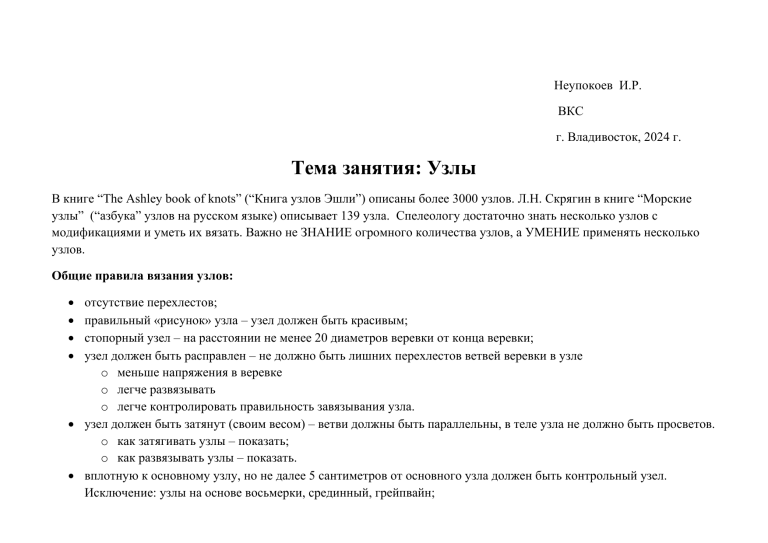 Неупокоев И.Р. ВКС г. Владивосток, 2024 г. Тема занятия: Узлы В книге “The Ashley book of knots” (“Книга узлов Эшли”) описаны более 3000 узлов. Л.Н. Скрягин в книге “Морские узлы” (“азбука” узлов на русском языке) описывает 139 узла. Спелеологу достаточно знать несколько узлов с модификациями и уметь их вязать. Важно не ЗНАНИЕ огромного количества узлов, а УМЕНИЕ применять несколько узлов. Общие правила вязания узлов: отсутствие перехлестов; правильный «рисунок» узла – узел должен быть красивым; стопорный узел – на расстоянии не менее 20 диаметров веревки от конца веревки; узел должен быть расправлен – не должно быть лишних перехлестов ветвей веревки в узле o меньше напряжения в веревке o легче развязывать o легче контролировать правильность завязывания узла. • узел должен быть затянут (своим весом) – ветви должны быть параллельны, в теле узла не должно быть просветов. o как затягивать узлы – показать; o как развязывать узлы – показать. • вплотную к основному узлу, но не далее 5 сантиметров от основного узла должен быть контрольный узел. Исключение: узлы на основе восьмерки, срединный, грейпвайн; • • • • • размер свободного конца веревки после затягивания узла должен быть не менее 7 диаметров веревки. Термины • ходовой конец - незакрепленный свободный конец троса, которым начинают движение при вязке узла; • коренной конец (коренная часть) - конец троса, закрепленный неподвижно или не используемый при вязке узла; противоположен ходовому концу; • петля (открытая) - ходовой (или коренной) конец троса, изогнутый вдвое таким образом, что не перекрещивается с самим собой; • колышка (закрытая петля) - петля, сделанная ходовым или коренным концом троса так, что трос перекрещивается сам с собой; • полуузел - одинарный перехлест двух разных концов одного и того же троса или двух концов разных тросов. Это первая половина прямого или бабьего узла; • обнос — обхват тросом какого-либо предмета (бревна, столба, другого троса, кольца, рыма, скобы, гака и пр.), сделанный таким образом, что оба конца троса не перекрещиваются; • шлаг - полный оборот (на 360 градусов) каната вокруг какого-либо предмета (бревна, столба, другого троса, кольца, рыма, скобы, гака и пр.), сделанный так, что после этого конец троса направлен в противоположную сторону; • полуштык — обнос тросом какого-либо предмета (бревна, столба, другого троса, кольца, рыма, скобы, гака и пр.) с последующим перекрещиванием тросом своего конца под прямым углом, без его пропускания в образовавшуюся закрытую петлю (не путать с названием узла "простой полуштык"). Многие узлы можно вязать несколькими способами. • Достаточно УМЕТЬ! пользоваться одним способом. Многие узлы имеют несколько названий. • Альпийская бабочка = австрийский проводник = узел среднего = срединный проводник = ездовая петля = бергшафт = английский узел. Названия узлов могут быть: • Очевидными: o 8-ка, 9-ка, простой, беседочный, среднего. • Понятными только специалистам: o Брам-шкотовый узел - так же, как и шкотовый узел, свое название получил от наименования снасти – брамшкот, которой растягивают шкотовые углы нижней кромки прямого паруса при постановке брамселей. Но, если шкотовым узлом ввязывают одинарные шкоты нижних парусов, то брам-шкотовым узлом ввязывают брам-шкоты и бом-брам-шкоты, брам-фалы и бом-брам-фалы, а также брам-гитовы. Немного теории. Сила 