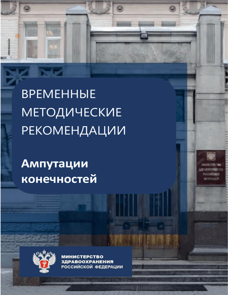 ВРЕМЕННЫЕ МЕТОДИЧЕСКИЕ РЕКОМЕНДАЦИИ Ампутации конечностей СОГЛАСОВАНО Заместитель Министра здравоохранения Российской Федерации Е.Г. Камкин ВРЕМЕННЫЕ МЕТОДИЧЕСКИЕ РЕКОМЕНДАЦИИ АМПУТАЦИИ КОНЕЧНОСТЕЙ Оглавление Введение. ........................................................................................................................ 7 Глава 1. Основные понятия и эпидемиология ампутаций конечностей ................. 8 Глава 2. Показания и противопоказания к ампутациям .......................................... 12 Показания ............................................................................................................... 12 Заболевания периферических сосудов............................................................ 12 Травмы, ожоги и отморожения ........................................................................ 14 Опухоли .............................................................................................................. 17 Инфекция ........................................................................................................... 18 Врожденные дефекты, деформации и аномалии развития конечностей .... 18 Противопоказания к ампутациям нижней конечности ..................................... 19 Глава 3. Прогнозирование исходов ампутаций........................................................ 20 Глава 4. Диагностика в интересах ампутаций на нижней конечности .................. 23 Лабораторная диагностика ................................................................................... 23 Методы лучевой и ультразвуковой диагностики………………………………23 Другие методы обследования .............................................................................. 24 Глава 5. Техника ампутаций на нижней конечности............................................... 25 Общие вопросы планирования уровня ампутации, формирования культи и периоперационного лечения ............................................................................. 25 Ампутации на уровне стопы ................................................................................ 32 Трансметатарзальнаая ампутация ....................................................................... 34 Экзартикуляция на уровне сустава Шопара ....................................................... 37 Ампутация по Н.И. Пирогову (по Сайму) .......................................................... 38 Ампутация Boyd .................................................................................................... 41 Транстибиальная ампутация ................................................................................ 43 Экзартикуляция на уровне коленного сустава ................................................... 47 Трансфеморальные ампутации ............................................................................ 51 Экзартикуляция на уровне тазобедренного сустава .......................................... 54 Гемипельвэктомия................................................................................................. 55 Глава 6. Техника ампутаций на верхней конечности .............................................. 59 Общие принципы ампутации верхних конечностей ......................................... 59 3 Ампутации дистальных фаланг ........................................................................... 60 Ампутации первого пальца .................................................................................. 71 Ампутации нескольких пальцев .......................................................................... 73 Ампутации кисти................................................................................................... 74 Ампутации на уровне запястья ........................................................................ 75 Экзартикуляция на уровне кистевого сустава ............................................... 75 Дистальные ампутации предплечья (дистальные трансрадиальные ампутации) ............................................................................................................. 77 Проксимальные ампутации предплечья (проксимальные трансрадиальные ампутации) ............................................................................................................. 78 Экзартикуляция на уровне локтевого сустава ................................................... 79 Ампутации на уровне плеча (трансхумеральные ампутации) ......................... 81 Ампутации в надмыщелковой обл
