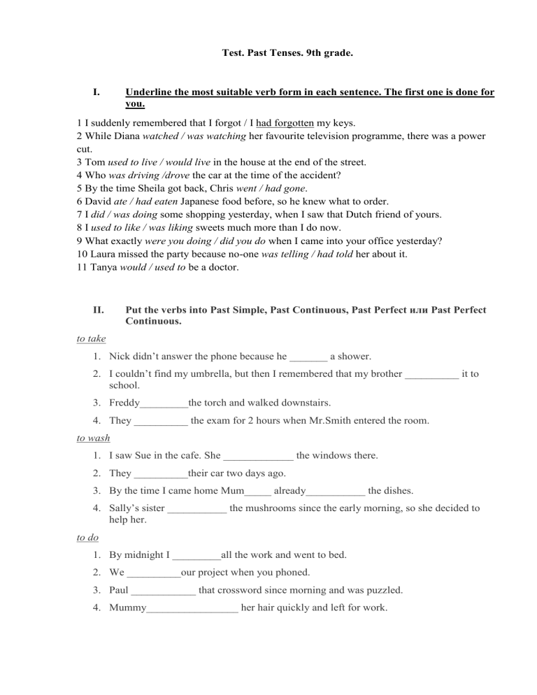 Test. Past Tenses. 9th grade. I. Underline the most suitable verb form in each sentence. The first one is done for you. 1 I suddenly remembered that I forgot / I had forgotten my keys. 2 While Diana watched / was watching her favourite television programme, there was a power cut. 3 Tom used to live / would live in the house at the end of the street. 4 Who was driving /drove the car at the time of the accident? 5 By the time Sheila got back, Chris went / had gone. 6 David ate / had eaten Japanese food before, so he knew what to order. 7 I did / was doing some shopping yesterday, when I saw that Dutch friend of yours. 8 I used to like / was liking sweets much more than I do now. 9 What exactly were you doing / did you do when I came into your office yesterday? 10 Laura missed the party because no-one was telling / had told her about it. 11 Tanya would / used to be a doctor. II. Put the verbs into Past Simple, Past Continuous, Past Perfect или Past Perfect Continuous. to take 1. Nick didn’t answer the phone because he _______ a shower. 2. I couldn’t find my umbrella, but then I remembered that my brother __________ it to school. 3. Freddy_________the torch and walked downstairs. 4. They __________ the exam for 2 hours when Mr.Smith entered the room. to wash 1. I saw Sue in the cafe. She _____________ the windows there. 2. They __________their car two days ago. 3. By the time I came home Mum_____ already___________ the dishes. 4. Sally’s sister ___________ the mushrooms since the early morning, so she decided to help her. to do 1. By midnight I _________all the work and went to bed. 2. We __________our project when you phoned. 3. Paul ____________ that crossword since morning and was puzzled. 4. Mummy_________________ her hair quickly and left for work. III. Choose the correct forms of the predicates in the Past Tenses: 1. They left after we ______ the program. a) had discussed b) was discussing c) had been discussing d) discussed 2. We were tired as we ________ for more than four hours a) was walking b) walked c) had been walking d) had walked 3. My brother ______ very shy in his childhood. a) did b) had been c) were d) was 4. What ________ last Monday? a) happened b) was happening c) had happened d) happens 5. It ______ all day yesterday. a) rained b) was raining c) had rained d) had been rained 6. We ______ great fun at the Halloween party last year. a) was having b) had c) has had d) are having 7. At last he got the opportunity he _______ for so long. a) had been waiting b) waited c) were waiting d) is waiting 8. When I came home my father ______ dinner and was looking through the newspaper. a) is having b) were having c) had had d) had 9. I thought she was the most intellectual woman I __ ever _____. a) has met b) was meeting c) met d) had met 10. The room looked beautiful, as she _______ the furniture and the curtains. a) had changed b) changed c) was changing d) is changing IV.Rewrite the sentences using used to Example: She was a Science teacher. She isn’t now. — She used to be a Science teacher. 1.We didn’t have a dishwasher when I was little. 2. Jim played in the team last year. He doesn’t play anymore. 3. I knew few famous people. Now many of them are my friends. 4. My granny enjoyed knitting. Now she prefers outdoor activities. 5. My skin looked pale in spring. Now I’m sun-tanned. 6. My sister doesn’t live with us anymore. She got married and moved to Paris.