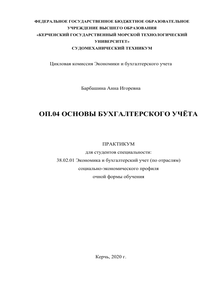 ФЕДЕРАЛЬНОЕ ГОСУДАРСТВЕННОЕ БЮДЖЕТНОЕ ОБРАЗОВАТЕЛЬНОЕ УЧРЕЖДЕНИЕ ВЫСШЕГО ОБРАЗОВАНИЯ «КЕРЧЕНСКИЙ ГОСУДАРСТВЕННЫЙ МОРСКОЙ ТЕХНОЛОГИЧЕСКИЙ УНИВЕРСИТЕТ» СУДОМЕХАНИЧЕСКИЙ ТЕХНИКУМ Цикловая комиссия Экономики и бухгалтерского учета Барбашина Анна Игоревна ОП.04 ОСНОВЫ БУХГАЛТЕРСКОГО УЧЁТА ПРАКТИКУМ для студентов специальности: 38.02.01 Экономика и бухгалтерский учет (по отраслям) социально-экономического профиля очной формы обучения Керчь, 2020 г. 2 СОДЕРЖАНИЕ ВВЕДЕНИЕ 4 ПРАКТИЧЕСКОЕ ЗАНЯТИЕ №1 6 ПРАКТИЧЕСКОЕ ЗАНЯТИЕ №2 13 ПРАКТИЧЕСКОЕ ЗАНЯТИЕ №3 18 ПРАКТИЧЕСКОЕ ЗАНЯТИЕ №4 25 ПРАКТИЧЕСКОЕ ЗАНЯТИЕ №5 28 ПРАКТИЧЕСКОЕ ЗАНЯТИЕ №6 31 ПРАКТИЧЕСКОЕ ЗАНЯТИЕ №7 35 ПРАКТИЧЕСКОЕ ЗАНЯТИЕ №8 41 ПРАКТИЧЕСКОЕ ЗАНЯТИЕ №9 46 ПРАКТИЧЕСКОЕ ЗАНЯТИЕ №10 49 ПРАКТИЧЕСКОЕ ЗАНЯТИЕ №11 53 ПРАКТИЧЕСКОЕ ЗАНЯТИЕ №12 57 СПИСОК ЛИТЕРАТУРЫ 60 3 ВВЕДЕНИЕ В условиях рыночной экономики для обеспечения четкого управления работой организации, анализа иконтроля за состоянием хозяйственных средств и источников, за результатами хозяйственной деятельности и сохранностью собственности требуется учетная информация. Чтобы успешно вести учет в любой организации, необходимо знать основы его построения. «Основы бухгалтерского учета» являются одной из общепрофессиональных дисциплин в системе подготовки специалистов среднего звена по специальности 38.02.01 «Экономика и бухгалтерский учёт (по отраслям)». Данная дисциплина объединяет вопросы изучения теоретических основ учета и его методологии, начиная с хозяйственного учета и его сущности и заканчивая учетными регистрами и способами исправления ошибок в них. Целью изучения дисциплины «Основы бухгалтерского учета» является определение объектов, основных задач бухгалтерского учета, его основ, места в системе управления организацией; рассмотрение и практическая адаптация базовых принципов, допущений и методов, используемых в бухгалтерском учете. Задачами дисциплины «Основы бухгалтерского учета» являются: раскрытие сущности и содержания бухгалтерского учета; изучение основ законодательного и нормативного регулирования учета; усвоение основных понятий, используемых в учете; раскрытие предмета и метода бухгалтерского учета, его форм и процедур; ознакомление с основами бухгалтерской отчетности и принципами учета основных хозяйственных процессов. Цель практикума – проверка и закрепление учебного теоретического материала, развитие у студентов навыков по практическому применению знаний в области основ бухгалтерского учета. Практикум содержит задания для проведения практических занятий при изучении дисциплины «Основы бухгалтерского учета» и полностью соответствует программе этой дисциплины, составленной в соответствии с требованиями федерального государственного стандарта среднего профессионального образования (ФГОС СПО) по специальности 38.02.01 «Экономика и бухгалтерский учет по отраслям». Материал в практикуме расположен по темам, а внутри тем задачи сгруппированы в практические занятия. Практикум позволит студентам, последовательно выполняя задания, освоить навыки составления бухгалтерских проводок и заполнения первичных документов. Оценка «отлично» выставляется обучающемуся, если он умеет тесно увязывать теорию с практикой, свободно справляется с задачами и вопросами, не затрудняется с ответами пр