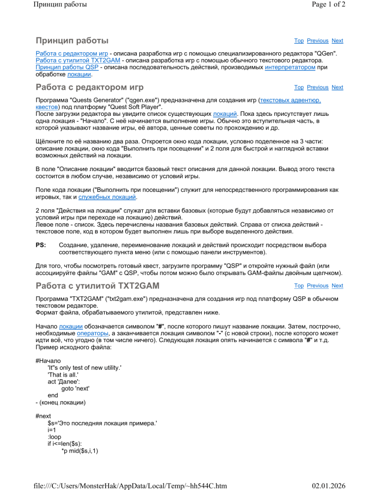 Принцип работы Принцип работы Page 1 of 2 Top Previous Next Работа с редактором игр - описана разработка игр с помощью специализированного редактора "QGen". Работа с утилитой TXT2GAM - описана разработка игр с помощью обычного текстового редактора. Принцип работы QSP - описана последовательность действий, производимых интерпретатором при обработке локации. Работа с редактором игр Top Previous Next Программа "Quests Generator" ("qgen.exe") предназначена для создания игр (текстовых адвентюр, квестов) под платформу "Quest Soft Player". После загрузки редактора вы увидите список существующих локаций. Пока здесь присутствует лишь одна локация - "Начало". С неё начинается выполнение игры. Обычно это вступительная часть, в которой указывают название игры, её автора, ценные советы по прохождению и др. Щёлкните по её названию два раза. Откроется окно кода локации, условно поделенное на 3 части: описание локации, окно кода "Выполнить при посещении" и 2 поля для быстрой и наглядной вставки возможных действий на локации. В поле "Описание локации" вводится базовый текст описания для данной локации. Вывод этого текста состоится в любом случае, независимо от условий игры. Поле кода локации ("Выполнить при посещении") служит для непосредственного программирования как игровых, так и служебных локаций. 2 поля "Действия на локации" служат для вставки базовых (которые будут добавляться независимо от условий игры при переходе на локацию) действий. Левое поле - список. Здесь перечислены названия базовых действий. Справа от списка действий текстовое поле, код в котором будет выполнен лишь при выборе выделенного действия. PS: Создание, удаление, переименование локаций и действий происходит посредством выбора соответствующего пункта меню (или с помощью панели инструментов). Для того, чтобы посмотреть готовый квест, загрузите программу "QSP" и откройте нужный файл (или ассоциируйте файлы "GAM" с QSP, чтобы потом можно было открывать GAM-файлы двойным щелчком). Работа с утилитой TXT2GAM Top Previous Next Программа "TXT2GAM" ("txt2gam.exe") предназначена для создания игр под платформу QSP в обычном текстовом редакторе. Формат файла, обрабатываемого утилитой, представлен ниже. Начало локации обозначается символом "#", после которого пишут название локации. Затем, построчно, необходимые операторы, а заканчивается локация символом "-" (с новой строки), после которого может идти всё, что угодно (в том числе ничего). Следующая локация опять начинается с символа "#" и т.д. Пример исходного файла: #Начало 'It''s only test of new utility.' 'That is all.' act 'Далее': goto 'next' end - (конец локации) #next $s='Это последняя локация примера.' i=1 :loop if i<=len($s): *p mid($s,i,1) file:///C:/Users/MonsterHak/AppData/Local/Temp/~hh544C.htm 02.01.2026 Принцип работы Page 2 of 2 wait 200 i=i+1 jump 'loop' - end *nl & 'Это всё.' Пример запуска утилиты: txt2gam.exe game.txt game.gam Здесь: "game.txt" - имя исходного файла, "game.gam" - имя файла, в котором будет сохранена игра. PS: 1) Между локациями может находиться любой текст, не начинающийся с символа "#". В результирующем файле данный текст присутствовать не будет. 2) При указании параметра "u" в командной строке, исходный файл будет обрабатываться как Unicode-файл (кодировка UCS-2 LE / UTF-16 LE). 3) Для получения дополнительной информации об утилите, запустите её в консоли без параметров. Принцип работы QSP Top Previous Next При обработке новой локации (например, при переходе с помощью операторов "GOTO, XGOTO, GOSUB") выполняются следующие действия: 1) Очистка списка действий