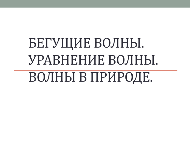 БЕГУЩИЕ ВОЛНЫ. УРАВНЕНИЕ ВОЛНЫ. ВОЛНЫ В ПРИРОДЕ. Бегущая волна – волна, которая при распространении в среде переносит энергию. Уравнение бегущей волны Уравнение волны позволяет в любой момент времени определить смещение данной точки среды, в которой распространяется волна. 𝒔 = 𝒔𝒎 𝐬𝐢𝐧 𝝎𝒕 𝒔 = 𝒔𝒎 𝐬𝐢𝐧 𝝎 𝒕 − 𝝉 𝒙 𝝉= 𝒗 𝒙 𝒔 = 𝒔𝒎 𝐬𝐢𝐧 𝝎 𝒕 − 𝒗 Уравнение гармонической бегущей волны можно записать в виде: s = smsin (ωt – kx), где k — волновое число 𝝎 𝒌= 𝝑 𝟐𝝅 𝒌= 𝝀 Фазы колебаний двух точек, находящихся на расстоянии λ, отличаются на 2π, то есть колебания происходят в фазе. ВОЛНЫ В СРЕДЕ Геометрическое место точек, в которых колебания происходят в одной фазе, называется волновой поверхностью. Луч — линия, перпендикулярная к волновой поверхности и к фронту волны. Направление луча указывает направление переноса энергии волной. Фронт волны — геометрическое место точек, до которых дошло возмущение к данному моменту времени. Волновой фронт также является волновой поверхностью. Фронт волны отделяет часть пространства, в котором колебания уже есть, от части пространства, в которой колебания отсутствуют. Плоская волна – это волна, волновые поверхности которой представляют собой совокупность параллельных друг другу плоскостей. Пример плоской волны – волна, возникающая в цилиндре с газом, при совершении колебаний поршнем. Сферическая волна – это волна, волновые поверхности которой представляют собой совокупность концентрических сфер Примерами сферических волн служат волны, генерируемые точечным источником в однородной среде. Задача 1 • Определите скорость распространения υ поперечной волны в струне, площадь поперечного сечения которой S , если модуль силы ее натяжения F можно считать постоянным, а плотность вещества, из которого изготовлена струна равна ρ. Задача 2 • Определить частоту звуковых колебаний в стали, если расстояние между ближайшими различающимися по фазе на Δφ= 90° точками звуковой волны ℓ = 1,54 м. Скорость звуковых волн в стали v = 5000 м/с. Задача 3 • Плоская поперечная волна задана уравнением s = 2 • 10~4 sin (628 t - 0,3х), где s — смещение частицы в направлении, перпендикулярном направлению распространения волны, х — расстояние вдоль луча от источника колебаний. Определите частоту колебаний V, скорость распространения волны и, длину волны X и амплитуду колебаний скорости каждой частицы ит. Все величины в данном уравнении выражены в единицах СИ. • Задача 4 Точки, находящиеся на одном луче и удаленные от источника колебаний на L1=12м и L2=14,7м, колеблются с разностью фаз 3п/2 рад. Определите скорость распространения колебаний в данной среде, если период колебания источника 1мс. Задача 5 • Уравнение волны имеет вид x=sin 2,5πt. • Найти смещение от положения равновесия, скорость и ускорение точки, находящейся на расстоянии r = 20 м от источника колебаний, для момента времени t=1c после начала колебаний. Скорость распространения колебаний v=100 м/c