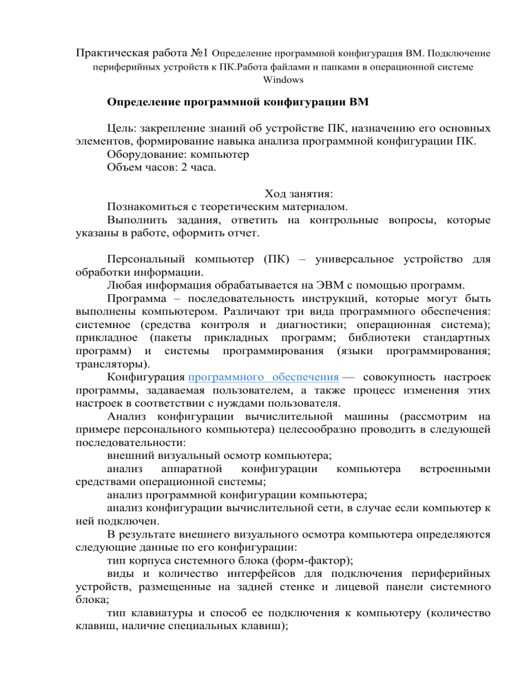 Практическая работа №1 Определение программной конфигурация ВМ. Подключение периферийных устройств к ПК.Работа файлами и папками в операционной системе Windows Определение программной конфигурации ВМ Цель: закрепление знаний об устройстве ПК, назначению его основных элементов, формирование навыка анализа программной конфигурации ПК. Оборудование: компьютер Объем часов: 2 часа. Ход занятия: Познакомиться с теоретическим материалом. Выполнить задания, ответить на контрольные вопросы, которые указаны в работе, оформить отчет. Персональный компьютер (ПК) – универсальное устройство для обработки информации. Любая информация обрабатывается на ЭВМ с помощью программ. Программа – последовательность инструкций, которые могут быть выполнены компьютером. Различают три вида программного обеспечения: системное (средства контроля и диагностики; операционная система); прикладное (пакеты прикладных программ; библиотеки стандартных программ) и системы программирования (языки программирования; трансляторы). Конфигурация программного обеспечения — совокупность настроек программы, задаваемая пользователем, а также процесс изменения этих настроек в соответствии с нуждами пользователя. Анализ конфигурации вычислительной машины (рассмотрим на примере персонального компьютера) целесообразно проводить в следующей последовательности: внешний визуальный осмотр компьютера; анализ аппаратной конфигурации компьютера встроенными средствами операционной системы; анализ программной конфигурации компьютера; анализ конфигурации вычислительной сети, в случае если компьютер к ней подключен. В результате внешнего визуального осмотра компьютера определяются следующие данные по его конфигурации: тип корпуса системного блока (форм-фактор); виды и количество интерфейсов для подключения периферийных устройств, размещенные на задней стенке и лицевой панели системного блока; тип клавиатуры и способ ее подключения к компьютеру (количество клавиш, наличие специальных клавиш); тип ручного манипулятора (мыши) и способ ее подключения к компьютеру (манипулятор с механической или оптической системой позиционирования, проводной или беспроводный интерфейс подключения); тип монитора (ЭЛТ или жидкокристаллический). Анализ аппаратной конфигурации компьютера, т.е. состава подключенных аппаратных средств, можно проанализировать специальными тестовыми программами, либо встроенными средствами операционной системы, включающей такое понятие как диспетчер устройств. Для просмотра содержимого диспетчера устройств найдите на рабочем столе ярлык Компьютер, далее выделите его и нажмите правую клавишу мыши. В открывшемся контекстном меню выберите пункт Свойства. В результате этого действия откроется окно Свойства системы. В окне Система просмотрите содержащуюся там информацию. Далее перейдите к закладке Диспетчер устройств. В открывшемся окне диспетчера устройств представлено графическое отображение перечня оборудования компьютера. Диспетчер устройств можно использовать для обновления драйверов (или программного обеспечения) оборудования, изменения настроек оборудования, а также для устранения неполадок и даже выключения оборудования из конфигурации компьютера. Современные Операционные системы предоставляют пользователю возможность нас