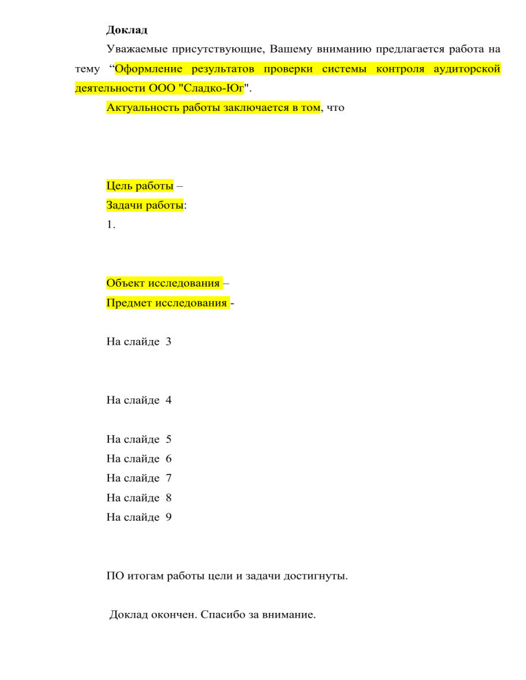Доклад Уважаемые присутствующие, Вашему вниманию предлагается работа на тему “Оформление результатов проверки системы контроля аудиторской деятельности ООО "Сладко-Юг". Актуальность работы заключается в том, что Цель работы – Задачи работы: 1. Объект исследования – Предмет исследования На слайде 3 На слайде 4 На слайде 5 На слайде 6 На слайде 7 На слайде 8 На слайде 9 ПО итогам работы цели и задачи достигнуты. Доклад окончен. Спасибо за внимание.