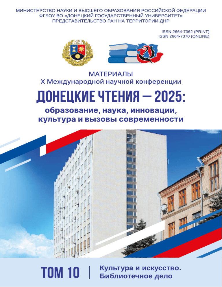 Уважаемые коллеги! Дорогие друзья! От имени Донецкого государственного университета, всего академического сообщества Донецкой Народной Республики приветствую наших друзей из различных регионов Российской Федерации и зарубежных стран, принимающих участие в традиционной, теперь уже X Международной научной конференции «Донецкие чтения – 2025: образование, наука, инновации, культура и вызовы современности». Минуло десять лет с тех пор, как в нашем университете прошла первая конференция, которая за прошедшие годы приобрела широкую известность, стала авторитетным научным собранием, привлекла внимание большого числа ученых. Расширился спектр рассматриваемых научных направлений и вовлеченность в научные дискуссии известных ученых и специалистов-практиков, возросли актуальность и практическая значимость представляемых научных результатов. Эпохальное событие – вхождение Донецкой Народной Республики в состав Российской Федерации – дало могучий толчок развитию и углублению наших научных исследований. Благодаря России мы получили достойное финансирование, новейшее оборудование, новые перспективные научные направления и наша общая цель – приложить все усилия к решению задач, которые ставит перед нами Родина. 2022–2031 годы объявлены Президентом России Владимиром Владимировичем Путиным как Десятилетие науки и технологий. Полагаю, что наша многопрофильная конференция вносит достойный вклад в решение задач, поставленных Президентом, в том числе и по привлечению талантливой молодёжи в науку! На Конференции будут представлены 1 950 научных докладов в четырнадцати профильных секциях. Будут работать семьдесят восемь подсекций и одиннадцать круглых столов. Труды конференции составляют десять томов в шестнадцати книгах общим объемом 5 980 страниц и будут размещены в электронной форме в наукометрической базе РИНЦ. Приглашаю вас к обстоятельному разговору о способах и механизмах скорейшего внедрения прорывных научных разработок, с тем чтобы наши достижения способствовали укреплению суверенитета и безопасности нашей и дружественных стран, росту качества жизни россиян. Желаю успехов всем участникам конференции, и всем нам – новых научных достижений во благо России! С наилучшими пожеланиями, руководитель Представительства Российской академии наук на территории Донецкой Народной Республики, ректор Донецкого государственного университета, доктор физико-математических наук, профессор Светлана Владимировна Беспалова Министерство науки и высшего образования Российской Федерации Федеральное государственное бюджетное образовательное учреждение высшего образования «Донецкий государственный университет» Представительство федерального государственного бюджетного учреждения «Российская академия наук» на территории Донецкой Народной Республики X Международная научная конференция, посвященная 60-летию создания Донецкого научного центра Материалы конференции Том 10 КУЛЬТУРА И ИСКУССТВО. БИБЛИОТЕЧНОЕ ДЕЛО Донецкие чтения – 2025: образование, наука, инновации, культура и вызовы современности г. Донецк 5–7 ноября 2025 г. Донецк Издательство ДонГУ 2025 ББК Ч11я431+Щ.я431+Ч73я431 УДК 7+008+02:004.9(043.2) Д672 Редакционная коллегия: С. В. Беспалова (гл. ред.), А. В. Белый (зам. гл. ред.), М. В. Фоменко, Н. А. Ярошенко, Д. Е. Муза, С. А. Могила, А. С. Бурляй (отв. с