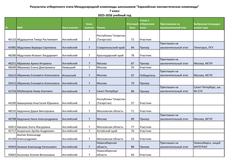 Результаты отборочного этапа Международной олимпиады школьников "Евразийская лингвистическая олимпиада" 7 класс 2025-2026 учебный год ID ФИО 40132 Абдрашитов Тимур Рустемович Язык участия Английский Класс участия 7 Регион Республика Татарстан (Татарстан) Статус в Итоговый отборочном балл этапе 72 Английский 7 Ставропольский край 84 Призер 48280 Абдуллаев Исмаил Эльдарович Английский 7 Краснодарский край 78 Участник 48251 Абрамова Арина Игоревна 46640 Абрамова Елена Дмитриевна Английский Немецкий 7 7 Москва Москва 87 35 Призер Участник 50415 Абрамова Елизавета Алексеевна Испанский 7 Москва 97 Победитель 50415 Абрамова Елизавета Алексеевна Английский 7 Москва 79 Призер Английский 7 Санкт-Петербург 88 Призер 37 Участник 44290 Аввакумова Анастасия Юрьевна Английский 7 Республика Татарстан (Татарстан) 48535 Авдонина Дарья Викторовна Английский 7 Московская область 71 Участник 48788 Авдонина Нина Александровна Английский 7 Москва 89 Призер 45812 Авезова Злата Жасуровна 45717 Акарачкин Артём Андреевич Акатин Александр 45330 Александрович Английский Английский 7 7 Московская область Алтайский край 77 76 Участник Участник Английский 7 Московская область Новосибирская область Новосибирская область 23 Участник 49463 Акимов Александр Евгеньевич Английский 7 50062 Аксенова Асения Витальевна Английский 7 Выбранная площадка очного тура Приглашен на заключительный этап Пятигорск, ПГУ Приглашен на заключительный этап Москва, МГЛУ Приглашен на заключительный этап Москва, МГЛУ Приглашен на заключительный этап Санкт-Петербург, шк. № 574 Приглашен на заключительный этап Москва, МГЛУ Приглашен на заключительный этап Новосибирск, лицей ИНТЕГРАЛ Участник 45985 Абдулаева Варвара Сергеевна 43759 Абубекеров Амир Азатович Приглашение на заключительный этап 88 Призер 60 Участник ID Статус в Итоговый отборочном балл этапе Язык участия Класс участия Регион 47074 Алакаева Анастасия Руслановна Корейский 7 Москва 58 Участник 49948 Алеева Арина Станиславовна Английский 7 71 Участник 44522 Алексеев Вадим Викторович Английский 7 Московская область Республика Саха (Якутия) 80 Призер 50671 Алексеева Диана Евгеньевна Алешкевич Анастасия 48714 Вячеславовна Английский 7 Московская область 77 Участник Английский 7 Приморский край 89 Призер 44527 Алимбекова Аделина Ренатовна Английский 7 Ульяновская область 53 Участник 85 Призер ФИО 43561 Алпитаров Тимур Рустемович Алугишвили Леван 43491 Владимирович Алугишвили Леван 43491 Владимирович Английский 7 Республика Татарстан (Татарстан) Немецкий 7 Москва 93 Призер Английский 7 35 Участник 49138 Алуста Айша Джамал-али 46957 Алферьева Любовь Петровна Английский Английский 7 7 Москва Новосибирская область Москва 52 70 Участник Участник 45518 Аль-Кудж Виктория Басемовна Английский 7 Москва 74 Участник 50167 Альмухаметов Кирилл Андреевич Английский 7 Москва 79 Призер 44106 Андреева Александа Кареновна Английский 7 Московская область 57 Участник 46475 Андрианов Егор Андреевич Английский 7 Москва 81 Призер 47157 Андриянова Ульяна Денисовна Английский 7 Республика Бурятия 51 Участник 46645 Антоненко Матвей Степанович Английский 7 Московская область 64 Участник Приглашение на заключительный этап Выбранная площадка очного тура Приглашен на заключительный этап Якутск, СВФУ Приглашен на заключительный этап Москва, МГЛУ Приглашен на заключительный этап Приглашен на заключительный этап Набережные Челны, НГПУ Москва, МГЛУ При