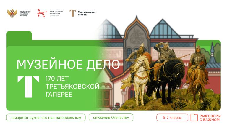 МУЗЕЙНОЕ ДЕЛО ЗАГОЛОВОК И ОБЪЕКТ 170 ЛЕТ ТРЕТЬЯКОВСКОЙ ГАЛЕРЕЕ приоритет духовного над материальным служение Отечеству 5-7 классы А. Венецианов. Вот-те и батькин обед! 1824 И. Репин. Стрекоза. 1884 В. Серов. Девочка с персиками. 1887 Н. Богданов-Бельский. Устный счет. В народной школе С.А. Рачинского. 1895 З. Серебрякова. За завтраком. 1914 Ф. Решетников. Опять двойка. 1952 ТРЕТЬЯКОВСКАЯ ГАЛЕРЕЯ: ОТ ЧАСТНОЙ КОЛЛЕКЦИИ К НАЦИОНАЛЬНОМУ ДОСТОЯНИЮ Портрет Павла Третьякова. Илья Репин, 1883 Фото: https://um.mos.ru/houses/tretyakovskaya_galereya/ Портрет Сергея Третьякова. Валентин Серов, 1895 Днем основания Третьяковской галереи принято считать 22 мая 1856 года: в этот день Павел Третьяков приобрел первую картину художника Худякова «Стычка с финляндскими контрабандистами» В. Васнецов «Богатыри». Фрагмент А. Саврасов «Грачи прилетели» И. Шишкин «Утро в сосновом лесу» ВЕЛИКИЕ: СКВОЗЬ ВЕКА В коллекции Третьяковской галереи много портретов русских писателей. Знаете ли вы, кто на них изображен? ВЕЛИКИЕ: СКВОЗЬ ВЕКА Проверьте себя! Л. Н. Толстой Н. В. Гоголь М. Ю. Лермонтов А. П. Чехов И. С. Тургенев Ф. М. Достоевский Картина Александра Иванова «Явление Христа народу» — самая большая в коллекции Третьяковской галереи: более 7 метров в длину. Для такой огромной картины специально выделили отдельный зал