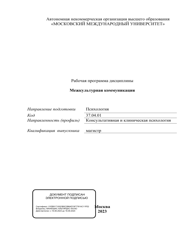 Автономная некоммерческая организация высшего образования «МОСКОВСКИЙ МЕЖДУНАРОДНЫЙ УНИВЕРСИТЕТ» Рабочая программа дисциплины Межкультурная коммуникация Направление подготовки Код Направленность (профиль) Психология 37.04.01 Консультативная и клиническая психология Квалификация выпускника магистр ДОКУМЕНТ ПОДПИСАН ЭЛЕКТРОННОЙ ПОДПИСЬЮ Сертификат: 01EB91710023B0C5B64D74F7781AC11FE2 Владелец: МАНЮШИС АЛЬГИРДАС ЮОЗО Действителен: с 16.06.2023 до 16.09.2024 Москва 2023 1. Перечень кодов компетенций, формируемых дисциплиной в процессе освоения образовательной программы Группа компетенций Код Категория компетенций Универсальные Коммуникация УК-4 Универсальные Межкультурное взаимодействие УК-5 2. Компетенции и индикаторы их достижения Код Формулировка компетенции компетенции УК-4 Способен применять современные коммуникативные технологии, в том числе на иностранном(ых) языке(ах), для академического и профессионального взаимодействия УК-5 Способен анализировать и учитывать разнообразие культур в процессе межкультурного взаимодействия Индикаторы достижения компетенции УК-4.1.: - применяет современные коммуникативные технологии на русском языке для академического и профессионального взаимодействия УК-4.2: - применяет современные коммуникативные технологии на иностранном языке (языках) для академического и профессионального взаимодействия УК-5.1: - адаптируется к условиям работы в составе многоэтничных и поликонфессиональных групп. УК-5.2: - конструктивно взаимодействует с людьми с учетом их социокультурных особенностей в целях успешного выполнения поставленных задач и усиления социальной интеграции, толерантно воспринимая социальные, этнические, конфессиональные и культурные различия. УК-5.3: - способен преодолевать коммуникативные, образовательные, этнические, конфессиональные барьеры для межкультурного взаимодействия и толерантно вести себя в поликультурном социуме (группе). 3. Описание планируемых результатов обучения по дисциплине и критериев оценки результатов обучения по дисциплине 3.1. Описание планируемых результатов обучения по дисциплине Планируемые результаты обучения по дисциплине представлены дескрипторами (знания, умения, навыки). Дескрипторы по дисциплине Код компетенции Код компетенции Знать Уметь Владеть УК-4. - виды и особенности письменных текстов и устных выступлений; - понимать общее содержание сложных текстов на абстрактные и конкретные темы, в том числе узкоспециальные тексты - осуществлять самостоятельный поиск и проводить анализ научной литературы; - подбирать литературу по теме, составлять двуязычный словарь; - переводить и реферировать специальную литературу; - подготавливать научные доклады и презентации на базе прочитанной специальной литературы; - объяснить свою точку зрения - навыками самостоятельной работы с научной литературой; - навыками обсуждения знакомой темы, делая важные замечания и отвечая на вопросы; - навыками создания простого связного текста по знакомым или интересующим его темам, адаптируя его для целевой аудитории УК-5. - системообразующие элементы психологии представителей этнических общностей; - национальное своеобразие культурных потребностей и традиций, социальных стереотипов поведения и жизни представителей конкретных этнических общностей; - нормы социокультурной и межкульту