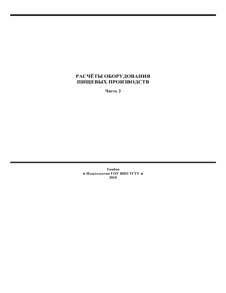 РАСЧЁТЫ ОБОРУДОВАНИЯ ПИЩЕВЫХ ПРОИЗВОДСТВ Часть 2 Тамбов ♦ Издательство ГОУ ВПО ТГТУ ♦ 2010 Министерство образования и науки Российской Федерации Государственное образовательное учреждение высшего профессионального образования «Тамбовский государственный технический университет» РАСЧЁТЫ ОБОРУДОВАНИЯ ПИЩЕВЫХ ПРОИЗВОДСТВ Часть 2 Методические указания и задания для выполнения практических самостоятельных работ для студентов специальностей 260601 «Машины и аппараты пищевых производств», 240902 «Пищевая биотехнология» всех форм обучения Тамбов Издательство ГОУ ВПО ТГТУ 2010 УДК 664(076) ББК Л81-5я73-5 Р248 Рекомендовано Редакционно-издательским советом университета Р е це н зе н ты : Заместитель главного конструктора ЗАО «Завод Тамбовполимермаш» А.В. Иванов Кандидат технических наук, доцент кафедры «Техника и технологии производства нанопродуктов» ГОУ ВПО ТГТУ З.А. Михалёва С о с т ав ит е ли : В.Н. Долгунин, А.Н. Куди, Е.В. Хабарова, В.А. Пронин, П.А. Иванов Р248 Расчёты оборудования пищевых производств : методические указания / сост. : В.Н. Долгунин, А.Н. Куди, Е.В. Хабарова, В.А. Пронин, П.А. Иванов. – Тамбов : Изд-во ГОУ ВПО ТГТУ, 2010. – Ч. 2. – 32 с. – 75 экз. Содержат справочные материалы и рекомендации по технологическому расчёту основных видов оборудования для разделения и смешения сырья и полуфабрикатов в пищевых производствах. Приведены индивидуальные задания для расчётов оборудования по вариантам. Предназначены для студентов специальностей 260601 «Машины и аппараты пищевых производств», 240902 «Пищевая биотехнология» всех форм обучения. УДК 664(076) ББК Л81-5я73-5 © Государственное образовательное учреждение высшего профессионального образования «Тамбовский государственный технический университет» (ГОУ ВПО ТГТУ), 2010 Учебное издание РАСЧЁТЫ ОБОРУДОВАНИЯ ПИЩЕВЫХ ПРОИЗВОДСТВ Методические указания Составители: ДОЛГУНИН Виктор Николаевич, КУДИ Андрей Николаевич, ХАБАРОВА Елена Владимировна, ПРОНИН Василий Александрович, ИВАНОВ Павел Александрович Редактор Л.В. Комбарова Инженер по компьютерному макетированию Т.Ю. Зото ва Подписано в печать 26.04.2010 Формат 60 × 84/16. 1,86 усл. печ. л. Тираж 75 экз. Заказ № 239 Издательско-полиграфический центр ГОУ ВПО ТГТУ 392000, Тамбов, ул. Советская, 106, к. 14 ВВЕДЕНИЕ Цель настоящего издания – помочь освоить студентам теоретический курс «Технологическое оборудование» и приобрести навыки инженерных расчётов. В соответствии с принятой в последнее время классификацией оборудования пищевых производств по функционально-технологическому признаку, ко второй группе относится оборудование для проведения технологических операций разделения и смешения сырья и полуфабрикатов. Методические указания по расчётам оборудования пищевых производств, часть 2 позволяют познакомиться со спецификой и с инженерными методиками расчёта основных видов оборудования указанной группы. Материал в методических указаниях сгруппирован по отдельным темам, что даёт возможность лучше ориентироваться при выборе задач. Внутри каждого раздела материал излагается в следующем порядке: краткая теория, справочные материалы и рекомендации по технологическому расчёту оборудования, задачи и индивидуальные задания по вариантам. Необходимой предпосылкой для решения задач является предварительное усвоение студентами теоретического материала, изложенного в