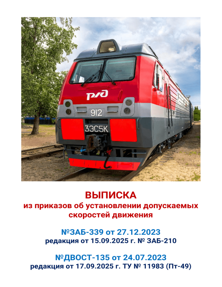 ВЫПИСКА из приказов об установлении допускаемых скоростей движения №ЗАБ-339 от 27.12.2023 редакция от 15.09.2025 г. № ЗАБ-210 №ДВОСТ-135 от 24.07.2023 редакция от 17.09.2025 г. ТУ № 11983 (Пт-49) 2 Перегон 70 80 БЕЛОГОРСК-1 – ОБЛУЧЬЕ (актуально на 30.09.25) №ЗАБ-339 (изм. 15.09.25), №ДВОСТ-135 (изм. 17.09.25) БЕЛОГОРСК-1 (7864пк10 – 7868пк4) 7864пк10 – 7865пк10 по стрелочным переводам 7866пк10 – 7867пк1 по стр. №113 на боковое направление По съездам №5-7, 19-21 Пути №III, №IV БЕЛОГОРСК-2 (7869пк7 – 7874пк9) V км/ч 70/40 40 40 25 40 70/40 Пути IIIБП, IVБП По съездам №98-100, 102-104, 105-107, 351-353 Соед. путь: 46 (197, 364) ВОЗЖАЕВКА (7892пк10 – 7894пк5) Путь №6 по МСУ №22-24 на 6-12 пути 7902пк9 – 7903пк6; 7906пк4 – 9 7910пк2 – 6; 7913пк7 – 9 ПОЗДЕЕВКА (7914пк1 – 7915пк8) 7914пк3 – 6; 7914пк8 7914пк7 (по стр. №14) Стр. №16 (Р50 1/9) 7915пк8 – 7916пк5; 7916пк9 – 7917пк4 7933пк9 – 7934пк1; 7937пк3 – 8 7938пк7 – 7940пк9; 7941пк4 – 7942пк6 ПРЖ ПРЖ ПРЖ 40 25 15 80/40 25 70 70 80/40 70 70 25* 70 70 70 ЕКАТЕРИНОСЛАВКА (7943пк8 – 7946пк4) По съездам №36-38 м/у гл., 50-52 м/у гл., 60-62 (на путь 16) 7948пк2 – 7949пк5; 7951пк3 – 8; 7956пк2 – 8 ПРЖ 7958пк7 –10; 7959пк5 – 9 ПРЖ 7960пк5 – 8; 7961пк2 – 5 ПРЖ 7961пк6 – 7962пк9 Кривые 7965пк5 – 9; 7966пк8 – 7967пк4 ПРЖ 7967пк7 – 7968пк2 Кривые 7968пк3 – 8; 7970пк5 – 7970пк10 ПРЖ 7971пк4 – 9 ПРЖ ТУР (7973пк9 – 7975пк1) ЗАВИТАЯ (7983пк5 – 7987пк7) 7986пк2 – 5 (стрелка №53) Кривые 7986пк6 – 7987пк7 Кривые По съездам №13-15, 28-30, 36-38, 42-44 По съездам №51-53, 78-80, 79-81 (на путь 25) По съездам №43-45, 65-67; Стр. №69, 130 (Р50 1/9) Путь №25 (43, 66) Путь №3Д (17, 63) 7998пк3 – 8006пк7 ПРЖ 70/40 25 70 70 70 65 70 65 70 70 80/40 65/40 40 50 25 25 25* 40 50 70 ТЮКАН (8007пк4 – 8008пк5) 8007пк4 – 8008пк9 8010пк4 – 6 80/40 70 70 3 ПРЖ ПРЖ ПРЖ Кривые ПРЖ ПРЖ t мин 11 26 22 27 31 13 22 20 Перегон БЕЛОГОРСК-1 – ОБЛУЧЬЕ (актуально на 30.09.25) №ЗАБ-339 (изм. 15.09.25), №ДВОСТ-135 (изм. 17.09.25) БУРЕЯ (8029пк1 – 8031пк3) 8034пк6 – 8040пк1 ПРЖ V км/ч 65/40 70 ДОМИКАН (8051пк2 – 8052пк4) 80/40 8060пк3 – 6; 8061пк2 – 8062пк5 АРХАРА (8078пк4 – 8082пк10) 8078пк4 – 8080пк3; 8080пк6 – 8081пк6 80 ПРЖ Кривые 8080пк4 – 5 Кривые 8078пк7 – 8080пк6; 8081пк6 – 8082пк8 (по 30, 23 пути) По стр. пер. №38 на 18 путь с 30 пути По нечётным путям и стрелочным пер. нечётной горловины 60 40 25 25 80 60 21 28 9 ТАТАКАН (8090пк9 – 8092пк1) 80/40 КАМЕННЫЙ КАРЬЕР (8095пк2) 80/40 БОГУЧАН (8100пк9 – 8102пк4) По пути №5, №6 РАЧИ (8111пк1 – 8112пк10) Съезд №105-107 80/40 25 60/40 25 11 УРИЛ (8120пк6 – 8121пк10) 8128пк9 – 8136пк9 ТАРМАНЧУКАН (8136пк10 – 8138пк2) Кривые 80/40 70 70/40 19 8136пк10 – 8137пк3 Стрелки 60 По межстрелочному участку №10-12 60 70 80/40 70 t мин 25 ТОННЕЛЬНЫЙ (8143пк2 – 4) КУНДУР ХАБАРОВСКИЙ (8154пк2 – 8155пк7) Съезд №9-11; Стр. №15 по направлению на 3 путь Стр. №14 по направлению на 6 путь По пути №6; По межстрелочным участкам №5-7, 13-17 60/40 60/40 25 25 25 КАЗАЧИЙ (8163пк4 – 8164пк10) 8165пк1 – 8168пк2 ЯДРИН (8183пк4 – 8185пк2) 60/40 60 60/40 Кривые По пути №3, №5 По съездам №20-22, 21-23 (по направ. с 1-го на 3 и 5 пути) ОБЛУЧЬЕ (8188пк6 – 8192пк3) По путям №13, 17 25 25 40 25 По межстрелочным участкам №18-20, №123-133 25 3 7 10 6 13 12 22 11 ТЕЛЕГРАММА № ИСХ-2710/ДВОСТ Т ОСИН Д.А. ОТ 20.04.2020 В связи с отрицательной динамикой (неравномерный износ рельс) на перегоне ТОННЕЛЬНЫЙ – КУНДУР ХАБАРОВСКИЙ (с 8143 км 8 пк по 8153 км 10 пк чётный путь). ЗАПРЕЩЕНО ПРИМЕНЯТЬ РЕКУПЕРАТИВНОЕ ТОРМОЖЕНИЕ. 4 Перегон 60 80 70 60 80 ОБЛУЧЬЕ – БЕЛОГОРСК-1 (актуально на 30.09.25) №ЗАБ-339 (изм. 15.09.25), №ДВОСТ-135 (изм. 17.09.25) ОБЛУЧЬЕ (8192пк6 – 8188пк7) По путям №13, 17 По межстрелочным участкам №18-20, №123-133 ЯДРИН (8185пк3 – 8183пк4) По пути №3, №5 V км/ч 40 25 25 60/40 25 По съездам №20-22, 21-23 (по направ. с 1-го на 3 и 5 пути) 8168пк4 – 1 Кривые 8167пк10 – 3 Кривые 8167пк2 – 8166пк8 Кривые 8166пк7 – 8165пк8 Кривые 8165пк7 – 8164пк10 Кривые КАЗАЧИЙ (8164пк9 – 8163пк5) 8164пк8 – 7 Кривые 25 60 70 60 70 60 70/40 60 8163пк7 – 5 Кривые 8156пк9 – 8155пк9 Кривые КУНДУР ХАБАРОВСКИЙ (8155пк8 – 8154пк1) Съезд №9-11; Стр. №15 по направлению на 3 путь С
