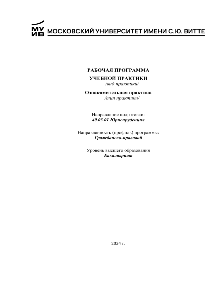 РАБОЧАЯ ПРОГРАММА УЧЕБНОЙ ПРАКТИКИ /вид практики/ Ознакомительная практика /тип практики/ Направление подготовки: 40.03.01 Юриспруденция Направленность (профиль) программы: Гражданско-правовой Уровень высшего образования Бакалавриат 2024 г. СОДЕРЖАНИЕ 1. ОБЩИЕ ПОЛОЖЕНИЯ ............................................................................................................3 1.1. Вид практики, способы и форма ее проведения ..................................................................3 1.2. Перечень планируемых результатов обучения при прохождении практики, соотнесенных с планируемыми результатами освоения образовательной программ ............4 Наименование категории (группы) компетенций ......................................................................4 Код и наименование компетенции ...............................................................................................4 Код и наименование индикатора достижения компетенции.....................................................4 1.3. Место практики в структуре образовательной программы ................................................4 1.4. Объем практики в зачетных единицах и ее продолжительность в неделях .....................5 2. СОДЕРЖАНИЕ ПРАКТИКИ ...................................................................................................5 2.1. Этапы практики и виды выполняемых работ ......................................................................5 2.2. Задания обучающимся на практику......................................................................................6 2.3. Особенности прохождения практики инвалидами и лицами с ограниченными возможностями здоровья ..............................................................................................................6 3. ФОРМЫ ОТЧЕТНОСТИ ПО РЕЗУЛЬТАТАМ ПРАКТИКИ ...............................................6 4. ОЦЕНОЧНЫЕ СРЕДСТВА ДЛЯ ПРОВЕДЕНИЯ ПРОМЕЖУТОЧНОЙ АТТЕСТАЦИИ ОБУЧАЮЩИХСЯ ПО ПРАКТИКЕ ...........................................................................................8 5. ПЕРЕЧЕНЬ УЧЕБНОЙ ЛИТЕРАТУРЫ И РЕСУРСОВ СЕТИ ИНТЕРНЕТ, НЕОБХОДИМЫХ ДЛЯ ПРОВЕДЕНИЯ ПРАКТИКИ ..............................................................8 6. ПЕРЕЧЕНЬ ИНФОРМАЦИОННЫХ ТЕХНОЛОГИЙ, ИСПОЛЬЗУЕМЫХ ПРИ ПРОВЕДЕНИИ ПРАКТИКИ, ВКЛЮЧАЯ ПЕРЕЧЕНЬ ПРОГРАММНОГО ОБЕСПЕЧЕНИЯ И ИНФОРМАЦИОННЫХ СПРАВОЧНЫХ СИСТЕМ ...............................9 7. ОПИСАНИЕ МАТЕРИАЛЬНО-ТЕХНИЧЕСКОЙ БАЗЫ, НЕОБХОДИМОЙ ДЛЯ ПРОХОЖДЕНИЯ ПРАКТИКИ..................................................................................................10 8. СВЕДЕНИЯ ОБ УТВЕРЖДЕНИИ ПРОГРАММЫ ПРАКТИКИ И ВНЕСЕНИИ ИЗМЕНЕНИЙ ..............................................................................................................................10 ПРИЛОЖЕНИЯ ...........................................................................................................................11 2 1. ОБЩИЕ ПОЛОЖЕНИЯ 1.1. Вид практики, способы и форма ее проведения При реализации ОПОП ВО по направлению 40.03.01 Юриспруденция, направленность (профиль) гражданско-правовой профиль предусматривается следующий вид практики: учебная практика. В соответствии с видами деятельности, на которые ориентирована данная программа бакалавриата, типом учебной практики является: ознакомительная практика. Способы проведения практики – стационарная и выездная. Практика реализуется дискретно по видам практик. Программа практики по направлению подготовки 40.03.01 Юриспруденция, направленность (профиль): гражданско-правовой разработана в соответствии с положениями и требованиями: Федеральный закон «Об образовании в Российской Федерации» от 29 декабря 2012 г. № 273-ФЗ; Федеральный государственный образовательный стандарт высшего образования – бакалавриата по направлению подготовки 40.03.01 Юриспруденция, утвержденный приказом Минобрнауки России от 13 августа 2020 г. № 1011; Указ Президента РФ от 21.07.2020 г. № 474 «О национальных целях р