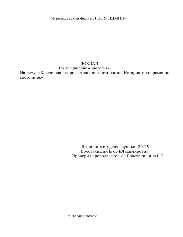 Чернышевский филиал ГПОУ «ШМПЛ» ДОКЛАД По дисциплине «Биология» На тему: «Клеточная теория строения организмов. История и современное состояние.» Выполнил студент группы: 39-25 Простакишин Егор ВЛадимирович Проверил преподаватель: Простакишина Н.С п. Чернышевск 2025 СОДЕРЖАНИЕ Введение........................................................................................................................... 1.Исторический экскурс: Зарождение и становление клеточной теории.............. 2.Основные положения клеточной теории в современном понимании.................. 3.Современное состояние клеточной теории и ее значение...................................... 4.Значение клеточной теории сегодня........................................................................ 5.Заключение............................................................................................................... I. Исторический экскурс: Зарождение и становление клеточной теории История клеточной теории – это история постепенного накопления знаний и развития микроскопической техники. XVII век: Первые шаги в микроскопию. o Роберт Гук (1665): Английский ученый Роберт Гук, используя усовершенствованный им микроскоп, впервые описал структуру пробки. Он заметил, что она состоит из множества мелких ячеек, которые он назвал "клетками" (от лат. cellula – "ячейка"). Важно отметить, что Гук наблюдал мертвые клетки, поэтому его описание было скорее структурным, чем функциональным. o Антони ван Левенгук (конец XVII века): Голландский натуралист Антони ван Левенгук, будучи искусным мастером изготовления линз, создал микроскопы с гораздо большим увеличением. Он впервые увидел и описал живые клетки: одноклеточные организмы (инфузории, бактерии), а также клетки крови, сперматозоиды и мышечные волокна. Его открытия продемонстрировали существование микроскопического мира и разнообразие живых форм. XVIII – начало XIX века: Накопление данных и первые обобщения. o В этот период многие ученые продолжали изучать различные ткани и органы растений и животных под микроскопом, накапливая описания клеточных структур. Однако единой, стройной теории еще не существовало. Первая половина XIX века: Формулировка основных положений клеточной теории. o Матиас Шлейден (1838): Немецкий ботаник Матиас Шлейден, изучая растительные ткани, пришел к выводу, что все растения состоят из клеток. Он предположил, что новые растительные клетки образуются из неклеточного вещества. o Теодор Шванн (1839): Немецкий зоолог Теодор Шванн, опираясь на работы Шлейдена и собственные исследования животных тканей, сформулировал аналогичный вывод для животных. Он считается одним из главных создателей клеточной теории, так как обобщил наблюдения над растениями и животными, заявив, что все живые организмы состоят из клеток и продуктов их жизнедеятельности. Основные положения клеточной теории Шлейдена и Шванна: 1. Все живые организмы состоят из клеток. i. Клетка является основной структурной и функциональной единицей живого. ii. Клетки образуются путем деления ранее существовавших клеток (это положение было сформулировано позже). Середина XIX века: Уточнение и дополнение теории. o Рудольф Вирхов (1858): Немецкий врач и патологоанатом Рудольф Вирхов внес важнейшее дополнение в клеточную теорию, сформулировав принцип "Omnis cellula e cellula" (всякая клетка от клетки). Он доказал, что новые клетки образуются только путем деления уже существующих клеток, опровергая теорию самозарождения Основные положения клеточной те