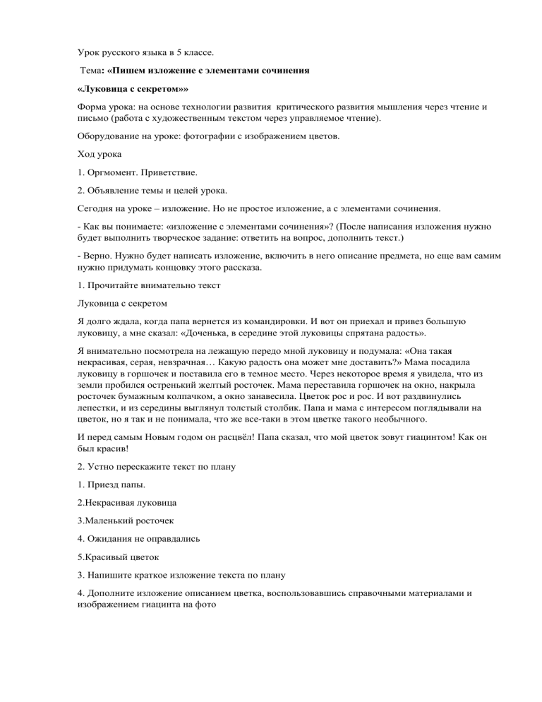 Урок русского языка в 5 классе. Тема: «Пишем изложение с элементами сочинения «Луковица с секретом»» Форма урока: на основе технологии развития критического развития мышления через чтение и письмо (работа с художественным текстом через управляемое чтение). Оборудование на уроке: фотографии с изображением цветов. Ход урока 1. Оргмомент. Приветствие. 2. Объявление темы и целей урока. Сегодня на уроке – изложение. Но не простое изложение, а с элементами сочинения. - Как вы понимаете: «изложение с элементами сочинения»? (После написания изложения нужно будет выполнить творческое задание: ответить на вопрос, дополнить текст.) - Верно. Нужно будет написать изложение, включить в него описание предмета, но еще вам самим нужно придумать концовку этого рассказа. 1. Прочитайте внимательно текст Луковица с секретом Я долго ждала, когда папа вернется из командировки. И вот он приехал и привез большую луковицу, а мне сказал: «Доченька, в середине этой луковицы спрятана радость». Я внимательно посмотрела на лежащую передо мной луковицу и подумала: «Она такая некрасивая, серая, невзрачная… Какую радость она может мне доставить?» Мама посадила луковицу в горшочек и поставила его в темное место. Через некоторое время я увидела, что из земли пробился остренький желтый росточек. Мама переставила горшочек на окно, накрыла росточек бумажным колпачком, а окно занавесила. Цветок рос и рос. И вот раздвинулись лепестки, и из середины выглянул толстый столбик. Папа и мама с интересом поглядывали на цветок, но я так и не понимала, что же все-таки в этом цветке такого необычного. И перед самым Новым годом он расцвёл! Папа сказал, что мой цветок зовут гиацинтом! Как он был красив! 2. Устно перескажите текст по плану 1. Приезд папы. 2.Некрасивая луковица 3.Маленький росточек 4. Ожидания не оправдались 5.Красивый цветок 3. Напишите краткое изложение текста по плану 4. Дополните изложение описанием цветка, воспользовавшись справочными материалами и изображением гиацинта на фото Эпитеты: цветы хрупкие, чудесные, изящные, синие-синие, душистые, лиловые, ароматные, неповторимые, удивительные, живые. Сравнения: как колокольчики, точно фарфоровые бубенчики, словно живое чудо. 3. Стадия вызова. Прием «Ассоциативное мышление». - Какие ассоциации возникают у вас, когда вы слышите слово «радость»? (Мнения детей записываются на доске: улыбка, счастье, подарок, «пятерка»). - Название рассказа, по которому напишем изложение, - «Луковица с радостью». Как вы думаете, о чем рассказ? (Дети высказывают свои предположения.) 4. Стадия осмысления. - Давайте начнем работать над текстом и проверим, насколько вы правы. (Учитель читает текст по отрывкам, после чтения каждого отрывка идет его обсуждение по вопросам.) 1) Я долго ждала, когда папа вернется из командировки. И вот он приехал и привез большую луковицу, а мне сказал: «Доченька, в середине этой луковицы спрятана радость». - Какое из слов-ассоциаций можно подобрать к этому предложению? (Подарок.) - Что можно сказать об отношениях в этой семье? (В семье царит любовь, забота друг о друге. Дочка ждет отца с нетерпением. Папа привозит для нее подарок, ласково обращается к ней «доченька».) - Как вы думаете, как поведет себя девочка? * Думаю, что обрадуется, ведь подарок от чистого сердца. * Считаю, что обрадуется, но и удивится: как это луковица может быть с секрет