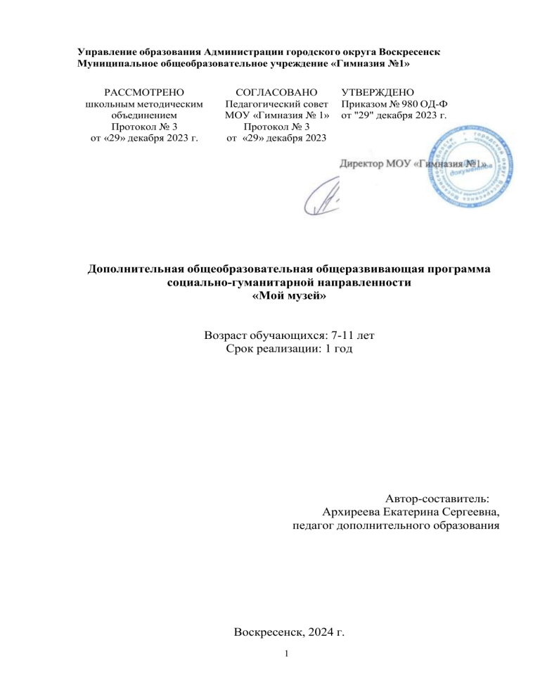 Управление образования Администрации городского округа Воскресенск Муниципальное общеобразовательное учреждение «Гимназия №1» РАССМОТРЕНО школьным методическим объединением Протокол № 3 от «29» декабря 2023 г. СОГЛАСОВАНО Педагогический совет МОУ «Гимназия № 1» Протокол № 3 от «29» декабря 2023 УТВЕРЖДЕНО Приказом № 980 ОД-Ф от "29" декабря 2023 г. Директор МО «Гимназия № 1» А.В. Елисеев А.В. Елисеев Дополнительная общеобразовательная общеразвивающая программа социально-гуманитарной направленности «Мой музей» Возраст обучающихся: 7-11 лет Срок реализации: 1 год Автор-составитель: Архиреева Екатерина Сергеевна, педагог дополнительного образования Воскресенск, 2024 г. 1 Пояснительная записка Дополнительная общеобразовательная общеразвивающая программа «Мой музей» имеет социально-гуманитарную направленность. Уровень программы – стартовый. Актуальность программы обусловлена тем, что в обучении школьников основам музейного дела используется интеграция музейной педагогики, основного и дополнительного образования через основные направления работы: Информирование. Первичное получение сведений о музее, составе и содержании его коллекций или об отдельных экспонатах. Создание электронных презентаций, электронных архивов-описей документов, информационных справок об отдельных экспонатах на уроках истории, литературы, географии, создание школьной газеты и информационного киоска на страничке сайта школы. Обучение. Передача и усвоение знаний, приобретенных умений и навыков. Обязательный фактор – неформальность и добровольность. Обучение осуществляется в форме экскурсий, музейных уроков, классных часов, занятий кружка, проектных работ. Экскурсии в музее проводят как взрослые, так и дети. Возможно привлечение уроков истории, литературы, географии, технологии. Творчество. Создание условий для стимулирования творческого процесса. Это направление реализуется с помощью педагогов дополнительного образования, проектной деятельности, викторин, исторических игр, фестивалей и встреч. Общение. Встречи с целью знакомства и общения с художниками, писателями и поэтами, ветеранами, знаменитыми выпускниками школы. Отдых. Организация свободного времени учащихся и взрослых. Дни открытых дверей (1 раз в триместр), концерты, чаепития для ветеранов и гостей школы. Педагогическая целесообразность данной программы объясняется тем, что формы и методы музейной педагогики дают возможность: - осуществлять нетрадиционный подход к образованию, основанный на интересе детей к исследовательской деятельности и компьютерному обучению; - сочетать эмоциональные и интеллектуальные воздействия на учеников; - раскрыть значимость и практический смысл изучаемого материала; - попробовать собственные силы и самореализоваться каждому ребенку; - объяснить сложный материал на простых и наглядных примерах; - организовать интересные уроки и дополнительные, факультативные и внеклассные занятия, исследовательскую работу в школьном музее и школе. Программа будет реализовываться в рамках работы школьного музея «Оберег» муниципального общеобразовательного учреждения «Гимназия №1» городского округа Воскресенск Московской области. Это определяет новизну программы. НОРМАТИВНАЯ БАЗА Программа составлена на основе: 1. Федеральный закон Российской Федерации от 29.12.201