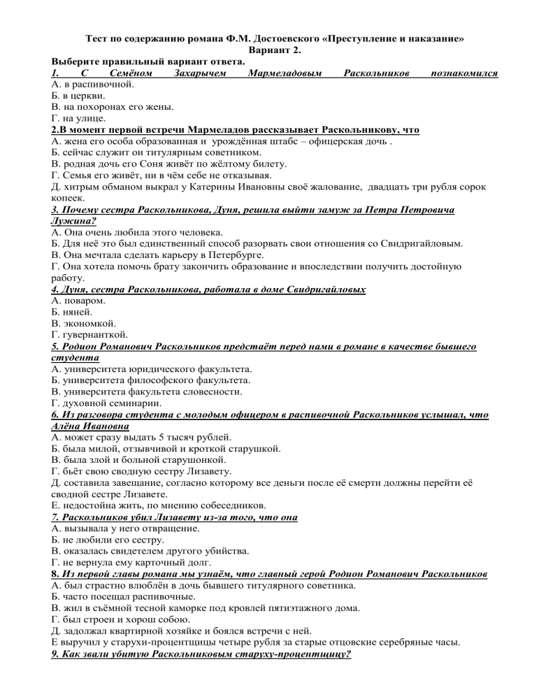 Тест по содержанию романа Ф.М. Достоевского «Преступление и наказание» Вариант 2. Выберите правильный вариант ответа. 1. С Семёном Захарычем Мармеладовым Раскольников познакомился А. в распивочной. Б. в церкви. В. на похоронах его жены. Г. на улице. 2.В момент первой встречи Мармеладов рассказывает Раскольникову, что А. жена его особа образованная и урождённая штабс – офицерская дочь . Б. сейчас служит он титулярным советником. В. родная дочь его Соня живёт по жёлтому билету. Г. Семья его живёт, ни в чём себе не отказывая. Д. хитрым обманом выкрал у Катерины Ивановны своё жалование, двадцать три рубля сорок копеек. 3. Почему сестра Раскольникова, Дуня, решила выйти замуж за Петра Петровича Лужина? А. Она очень любила этого человека. Б. Для неё это был единственный способ разорвать свои отношения со Свидригайловым. В. Она мечтала сделать карьеру в Петербурге. Г. Она хотела помочь брату закончить образование и впоследствии получить достойную работу. 4. Дуня, сестра Раскольникова, работала в доме Свидригайловых А. поваром. Б. няней. В. экономкой. Г. гувернанткой. 5. Родион Романович Раскольников предстаёт перед нами в романе в качестве бывшего студента А. университета юридического факультета. Б. университета философского факультета. В. университета факультета словесности. Г. духовной семинарии. 6. Из разговора студента с молодым офицером в распивочной Раскольников услышал, что Алёна Ивановна А. может сразу выдать 5 тысяч рублей. Б. была милой, отзывчивой и кроткой старушкой. В. была злой и больной старушонкой. Г. бьёт свою сводную сестру Лизавету. Д. составила завещание, согласно которому все деньги после её смерти должны перейти её сводной сестре Лизавете. Е. недостойна жить, по мнению собеседников. 7. Раскольников убил Лизавету из-за того, что она А. вызывала у него отвращение. Б. не любили его сестру. В. оказалась свидетелем другого убийства. Г. не вернула ему карточный долг. 8. Из первой главы романа мы узнаём, что главный герой Родион Романович Раскольников А. был страстно влюблён в дочь бывшего титулярного советника. Б. часто посещал распивочные. В. жил в съёмной тесной каморке под кровлей пятиэтажного дома. Г. был строен и хорош собою. Д. задолжал квартирной хозяйке и боялся встречи с ней. Е выручил у старухи-процентщицы четыре рубля за старые отцовские серебряные часы. 9. Как звали убитую Раскольниковым старуху-процентщицу? А. Амалия Фёдоровна Б. Алёна Ивановна В. Дарья Францовна Г. Марфа Петровна 10. Назовите героя по портрету или по характеристике. А. «Её нельзя было назвать и хорошенькою, но зато голубые глаза её были такие ясные, и когда оживлялись они, выражение лица её становилось такое доброе и простодушное, что невольно привлекало к ней. ..Несмотря на свои восемнадцать лет. Она казалась ещё девочкой, гораздо моложе своих лет, совсем почти ребёнком… Б. «Это был человек лет уже за пятьдесят, среднего роста и плотного сложения, с проседью и с большой лысиной, с отёкшим от постоянного пьянства жёлтым, даже зеленоватым лицом и с припухшими веками, из-за которых сияли крошечные, как щёлочки, но одушевлённые красноватые глазки. «...» Одет он был в старый, совершенно оборванный чёрный фрак, с осыпавшимися пуговицами. «...» Из-под нанкового жилета торчала манишка, вся скомканная, запачканная и залитая. Лицо было выбрито, по-чиновничьи, но давно уже, так что уж