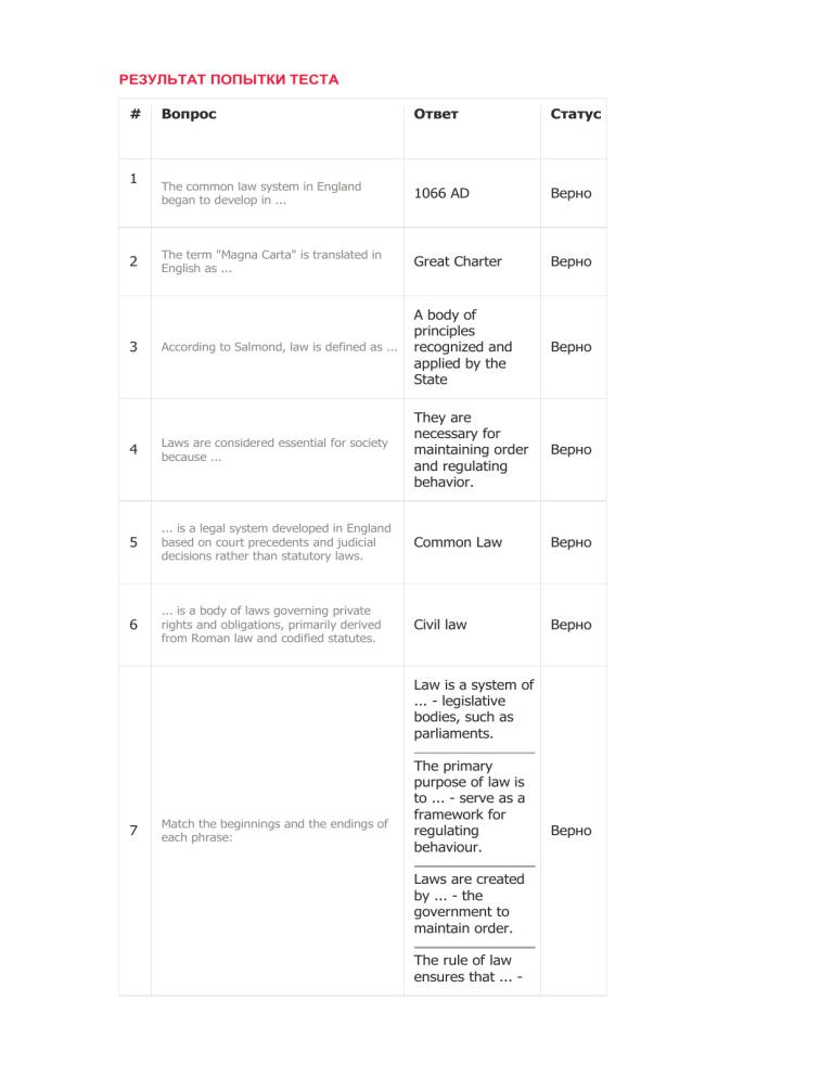РЕЗУЛЬТАТ ПОПЫТКИ ТЕСТА # Вопрос Ответ Статус The common law system in England began to develop in ... 1066 AD Верно The term "Magna Carta" is translated in English as ... Great Charter Верно According to Salmond, law is defined as ... A body of principles recognized and applied by the State Верно 4 Laws are considered essential for society because ... They are necessary for maintaining order and regulating behavior. Верно 5 ... is a legal system developed in England based on court precedents and judicial decisions rather than statutory laws. Common Law Верно 6 ... is a body of laws governing private rights and obligations, primarily derived from Roman law and codified statutes. Civil law Верно 1 2 3 Law is a system of ... - legislative bodies, such as parliaments. 7 Match the beginnings and the endings of each phrase: The primary purpose of law is to ... - serve as a framework for regulating behaviour. Laws are created by ... - the government to maintain order. The rule of law ensures that ... - Верно # Вопрос Ответ Статус all individuals are treated equally. Establishing standards Defines acceptable behavior and offenses 8 Match the principles of law with its purposes Maintaining order - Ensures peace and justice in society Верно Resolving disputes - Provides a framework for conflict resolution Protecting rights Safeguards individual liberties against infringement 1) Local customs were the primary regulations for social relations. 2) The AngloSaxon law governed most matters in England. 9 Put the following events of the development of law in chronological order: 3) The common law system in England began to develop after the Norman Conquest in 1066. 4) The influence of Roman law on England began with the Norman Conquest. Верно # Вопрос Ответ Статус 10 Read the text below and answer the question. There's only one correct answer. Text: Alex, a college student, recently rented an apartment near campus. After moving in, Alex discovered several issues: the heating system was broken, and there were leaks in the bathroom. Concerned about these problems, Alex contacted the landlord multiple times but received no response. Frustrated, Alex decided to research tenant rights. Through this research, Alex learned that local housing laws require landlords to maintain safe and habitable living conditions. With this knowledge, Alex sent a formal letter outlining the issues and referencing the relevant laws, demanding prompt repairs. After receiving the letter, the landlord quickly arranged for repairs. Alex felt empowered knowing that understanding the law helped resolve the situation effectively. Question: What is one of the key roles of law in Alex's situation? To provide a means for tenants to understand their rights and seek resolution. Верно РЕЗУЛЬТАТ ПОПЫТКИ ТЕСТА # 1 Вопрос Ответ Статус In civil law systems, the primary source of law is … Legislation Верно To provide guidelines for behaviour Верно The judiciary Не верно House of Commons Не верно 2 The purpose of legal norms is ... 3 The judicial power belongs to ... . 4 ... is a popular assembly elected in the UK for a term of not more than 5 years by almost universal adult suffrage. # Вопрос Ответ Статус Customary law is primarily based on … - long-standing traditions and practices. Religious legal systems derive their authority from … - sacred texts and religious doctrines. 5 Match the beginnings and the endings of each phrase: Mixed legal systems often combine elements of … various legal traditions and practices. Верно In many customary law systems, disputes are resolved by … - the community leaders or elders. United States - Common Law France - Civil Law 6 Match the countries with their legal systems: Saudi Arabia - Religious Law Верно India - Mixed Legal System Japan - Civil law influenced by Customary law 7 Match the key characteristics of continental law with examples: Written Codes - Laws are documented in comprehensive legal codes Верно # Вопрос Ответ Статус Inquisitorial System Judges actively investigate cases and question witnesses Oral Hearings - Procedures where parties present their cases orally in court Legal Certainty - The expectation of predictable and stable law Principle of Proportionality Legal outcomes that do not exceed the bounds of necessity Adversarial System - A system where two opposing parties present their case Discovery - A pre-trial procedure for gathering evidence 8 Match the concepts of common law with their implications: Burden of Proof - The obligation of one party to prove allegations Legal Key Terms - Terms that are crucial for understanding legal documents Equity - A body of law that provides remedies not available in common law Верно # 9 10 Вопрос The ... is responsible for interpreting the law and ensuring justice is served. In a criminal case, the … must prove the defendant's guilt beyond a reasonable doubt. Ответ Статус judiciary Не верно prosecution Верно РЕЗУЛЬТАТ ПОПЫТКИ ТЕСТА # 1 2 3 Вопрос Ответ Статус Which of the following is NOT a common area of law? Fashion Law Верно Laws established by the national government that apply uniformly across all states Верно International law regulates relations between states, while domestic law regulates relations within a state. Верно Federal law is … A key difference between international law and domestic law is … Criminal Law - The branch of law concerning crimes and punishments. 4 Верно Match the areas of law with their definitions: Civil Law - The body of law governing disputes between private individuals, # Вопрос Ответ Статус including obligations and liabilities. Contract Law - The area of law that gover