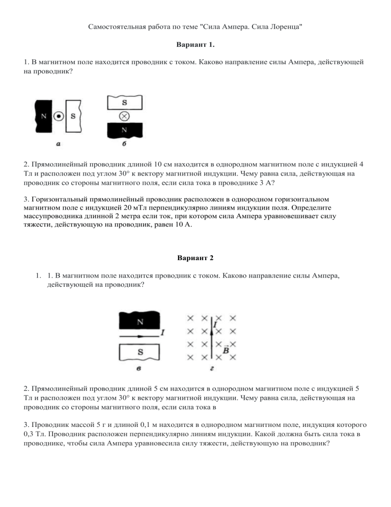 Самостоятельная работа по теме "Сила Ампера. Сила Лоренца" Вариант 1. 1. В магнитном поле находится проводник с током. Каково направление силы Ампера, действующей на проводник? 2. Прямолинейный проводник длиной 10 см находится в однородном магнитном поле с индукцией 4 Тл и расположен под углом 30° к вектору магнитной индукции. Чему равна сила, действующая на проводник со стороны магнитного поля, если сила тока в проводнике 3 А? 3. Горизонтальный прямолинейный проводник расположен в однородном горизонтальном магнитном поле с индукцией 20 мТл перпендикулярно линиям индукции поля. Определите массупроводника длинной 2 метра если ток, при котором сила Ампера уравновешивает силу тяжести, действующую на проводник, равен 10 А. Вариант 2 1. 1. В магнитном поле находится проводник с током. Каково направление силы Ампера, действующей на проводник? 2. Прямолинейный проводник длиной 5 см находится в однородном магнитном поле с индукцией 5 Тл и расположен под углом 30° к вектору магнитной индукции. Чему равна сила, действующая на проводник со стороны магнитного поля, если сила тока в 3. Проводник массой 5 г и длиной 0,1 м находится в однородном магнитном поле, индукция которого 0,3 Тл. Проводник расположен перпендикулярно линиям индукции. Какой должна быть сила тока в проводнике, чтобы сила Ампера уравновесила силу тяжести, действующую на проводник?