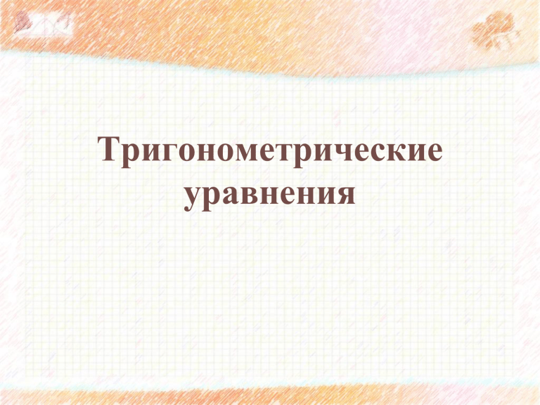Тригонометрические уравнения Определение Тригонометрические уравнения - уравнения, содержащие неизвестное под знаком тригонометрической функции. Решение тригонометрического уравнения состоит из двух этапов: • преобразование уравнения для получения его простейшего вида • решение полученного простейшего тригонометрического уравнения. Решение простейших тригонометрических уравнений Пример 1 Решить уравнение: 2 sin 4 x 1 0 Уравнение переносом слагаемого и делением обеих частей легко сводится к простейшему. 2 sin 4 x 1 0 2 sin 4 x 1 t 4 x 1 k 1 4 x 1 arcsin k 2 4 k Разделим обе части на 4 x 1 k 1 sin 4 x 2 k 16 k 4 x 1 k Ответ: 16 k 4 Пример 2 cos 3 x 0 Решить уравнение: 3 t 3x 3 Уравнение уже имеет простейший вид Это частный вид уравнения cos t=a при a=0 3 3x 3x 2 2 3 k k 3x x k 6 18 Ответ: (3) k 3 k x 18 3 Пример 3 Тригонометрические уравнения, приводимые к квадратным. Введем новую переменную t= , D=1-4*2*(-1)=9 ; ; х= , n∈Z , n∈Z Ответ: , n∈Z Пример 4 Решить уравнение: 2cos2x-sinx+1=0 2(1-sin2x)-sinx+1=0 -2sin2x-sinx+3=0 2sin2x+sinx-3=0 Пусть sinx=y, -1≤y≤1 2y2+y-3=0 y1=-1,5- не подходит по условию y2=1 Возвращаемся к старой переменной: sinx=1 x 2 2к , к Z Ответ: x 2 2к , к Z Пример 5 Однородные тригонометрические уравнения. разделим обе части уравнения на cosx 1. ; Ответ: x≠ +πn, n∈Z Пример 6 Решить уравнение:3 sin 2 x sin x cos x 4 cos2 x 0 3 sin 2 x sin x cos x 4 cos2 x 0 : cos2x 3tg 2 x tgx 4 0 пусть tg x t 3t 2 t 4 0 4 Корни этого уравнения t 1 и t 3 4 tg x 1 tg x 3 4 x arctg1 n x arctg( ) n 3 Ответ: x 4 n, n Z 4 x arctg n, n Z 3 Пример 7 x≠ +πn, n∈Z , n∈Z Ответ: , n∈Z Пример 8 Однородные тригонометрические уравнения второй степени. ; x≠ +πn, n∈Z D=1 – 4∗2∗ =9 , n∈Z , n∈Z Ответ: , n∈Z , n∈Z Спасибо за работу!