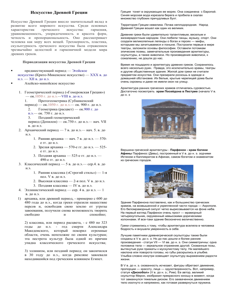 Искусство Древней Греции Искусство Древней Греции внесло значительный вклад в развитие всего мирового искусства. Среди основных характеристик греческого искусства: гармония, уравновешенность, упорядоченность и красота форм, четкость и пропорциональность. Оно рассматривает человека как меру всех вещей. Трехмерность, пластика, скульптурность греческого искусства была отражением чрезвычайно целостной и гармоничной модели мира древних греков. Периодизация искусства Древней Греции предшествующий период — Эгейское искусство (Крито-Микенское искусство) — ХХХ в. до н.э. — XII в. до н.э. Ахейско-минойское искусство 1. Геометрический период («Гомеровская Греция») — ок.1050 г. до н.э.—VIII в. до н.э. 1. Протогеометрика (Субмикенский период) — ок.1050 г. до н.э.— ок. 900 г. до н.э. 2. Геометрика (расцвет) — ок.900 г. до н.э.— ок. 750 г. до н.э. 3. Поздний геометрический период (Депилон) — ок.750 г. до н.э.— нач. VII в. до н.э. 2. Архаический период — 7 в. до н.э.— нач. 5. в. до н.э. 1. Ранняя архаика — нач. 7 в. до н.э. — 570е гг. до н.э. 2. Зрелая архаика — 570-е гг. до н.э. — 525е гг. до н.э. 3. Поздняя архаика — 525-е гг. до н.э. — 490-е гг. до н.э. 3. Классический период — 5 в. до н.э.— сер.4. в. до н.э. 1. Ранняя классика («Строгий стиль») — 1-я пол. V в. до н.э. 2. Высокая классика — 2-я пол. V в. до н.э. 3. Поздняя классика — IV в. до н.э. 4. Эллинистический период — сер. 4 в. до н.э. — 1 в. до н.э. 1) архаика, или древний период, - примерно с 600 до 480 года до н.э., когда греки отразили нашествие персов и, освободив свою землю от угрозы завоевания, получили снова возможность творить свободно и спокойно; 2) классика, или период расцвета, - с 480 по 323 годы до н.э. - год смерти Александра Македонского, который покорил огромные области, очень непохожие по своим культурам; эта пестрота культур была одной из причин упадка классического греческого искусства; 3) эллинизм, или поздний период; он закончился в 30 году до н.э., когда римляне завоевали находившийся под греческим влиянием Египет. Греция тонет в окружающих ее морях. Она соединена с Европой. Синяя морская вода изрезала берега и пробила в скалах множество глубоких причудливых бухт. Территория Греции невелика. Почва неплодородная. Народ Древней Греции вошел как один из великих. Древние греки были удивительно талантливым, веселым и жизнерадостным народом. Они любили танцы, музыку, спорт. Они создали великолепные легенды о богах и героях — мифы, которыми мы зачитываемся и поныне. Построили первые в мире театры, заложили основы философии. Оставили потомкам эпические поэмы, замечательные произведения архитектуры, скульптуры, а также живописи. Но произведения живописи, к сожалению, не дошли до нас. Время не пощадило и архитектуру древних греков. Сохранилось всего несколько руин. Правда, это исключительно храмы, театры и другие общественные здания. Жилой дом греки не считали предметом искусства. Они презирали роскошь в одежде и домашней обстановке. Их белые, крытые черепицей дома были очень скромны и даже не имели окон на улицу. Архитектура ранних греческих храмов отличалась суровостью. Достаточно посмотреть храм Посейдона в Пестуме (начало V в. до н. э Вершина греческой архитектуры - Парфенон - храм богини Афины Парфенос (Девы), построенный в V в. до н. э. зодчими Иктином и Калликратом в Афинах, самом богатом и знаменитом из греческих городов. Здание Парфенона поставлено, как и большинство гр