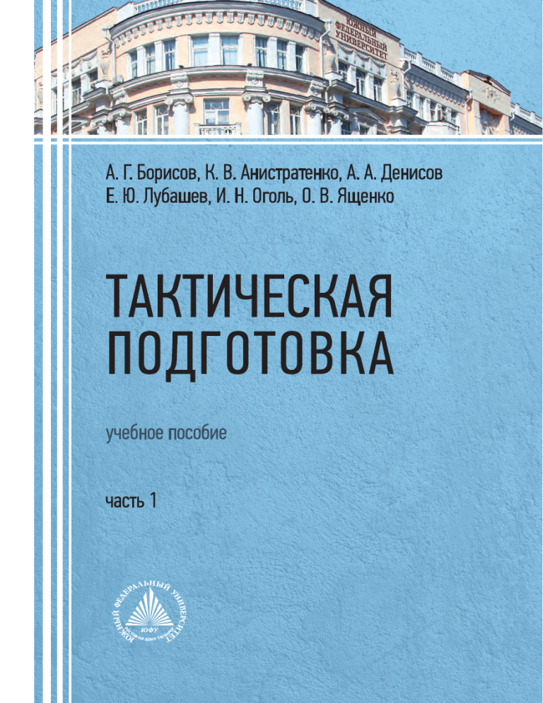 МИНИСТЕРСТВО НАУКИ И ВЫСШЕГО ОБРАЗОВАНИЯ РОССИЙСКОЙ ФЕДЕРАЦИИ Федеральное государственное автономное образовательное учреждение высшего образования «ЮЖНЫЙ ФЕДЕРАЛЬНЫЙ УНИВЕРСИТЕТ» Военный учебный центр ТАКТИЧЕСКАЯ ПОДГОТОВКА Учебное пособие В двух частях Часть 1 Ростов-на-Дону – Таганрог Издательство Южного федерального университета 2022 УДК 355.4(075.8) ББК 68.5/7 я73 Т15 Печатается по решению кафедры общевоенной подготовки №2 Военного учебного центра Южного федерального университета (Протокол № 10 от 07 апреля 2022 г.) Рецензенты: кандидат военных наук Донского промышленно-технического колледжа (ПУ №8) им. Б. Н. Слюсаря П. О. Середа; кандидат военных наук, профессор Военного центра Южного федерального университета Т. Б. Савкина Авторский коллектив: А. Г. Борисов, К. В. Анистратенко, А. А. Денисов, Е. Ю. Лубашев, И. Н. Оголь, О. В. Ященко Т15 Тактическая подготовка : в 2 ч. : учебное пособие / под общ. ред. кандидата военных наук, доцента А. Г. Борисова : Южный федеральный университет. – Ростов-на-Дону ; Таганрог : Издательство Южного федерального университета, 2022. ISBN 978-5-9275-4189-8 Ч. 1. – 2022. – 270 с. – ил. – 158, табл. – 15. ISBN 978-5-9275-4190-4 (Ч. 1) Учебное пособие предназначено для теоретической и практической подготовки студентов по учебной дисциплине «Тактическая подготовка» и учебному модулю «Тактическая подготовка и тактико-специальная подготовка». В пособии на основе положений научных теорий системного анализа, управления войсками, выработки и принятия решений раскрыты содержание актуальных тем учебной дисциплины «Тактическая подготовка» и учебного модуля «Тактическая подготовка и тактико-специальная подготовка». Предназначено для студентов военного учебного центра, обучающихся по программам военной подготовки офицеров, сержантов и солдат запаса. Может быть использовано преподавателями военного учебного центра при подготовке к проведению занятий и проведении занятий по учебной дисциплине «Тактическая подготовка», учебному модулю «Тактическая подготовка и тактико-специальная подготовка», а также в системе профессионально-должностной подготовки. ISBN 978-5-9275-4190-4 (Ч. 1) ISBN 978-5-9275-4189-8 УДК 355.4(075.8) ББК 68.5/7 я73 © Южный федеральный университет, 2022 © А. Г. Борисов, К. В. Анистратенко, А. А. Денисов, Е. Ю. Лубашев, И. Н. Оголь, О. В. Ященко, 2022 Оформление. Макет. Издательство Южного федерального университета, 2022 Оглавление ВВЕДЕНИЕ.....................................................................................................6 Раздел 1. ОБЩАЯ ТАКТИКА...............................................................13 1. Вооруженные Силы Российской Федерации ..........................13 1.1. Виды Вооруженных Сил Российской Федерации ..............14 1.2. Рода войск Вооруженных Сил Российской Федерации ..40 1.3. Специальные войска Вооруженных Сил Российской Федерации.......................................................................................43 Вопросы для контроля и самопроверки ........................................50 Литература.............................................................................................51 2. Основы общевойскового боя .........................................................52 2.1. Общевойсковой бой, его характерные черты и способы ведения .............................................................................................52 2.2. Основы применения подразделений в общевойсковом бою .....................................................................................................60 Вопросы для контроля и самопроверки ........................................67 Литература.............................................................................................68 3. Действия солдата в бою ........