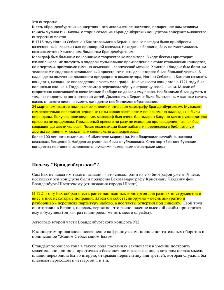 Это интересно Шесть «Бранденбургских концертов» – это историческое наследие, подаренное нам великим гением музыки И.С. Бахом. История создания «Бранденбургских концертов» содержит множество интересных фактов В 1718 году Иоганн Себастьян Бах отправился в Берлин. Целью поездки было приобрести качественный клавесин для придворной капеллы. Находясь в Берлине, Баху посчастливилось познакомится с Христианом Людвигом Бранденбургским. Маркграф был большим поклонником творчества композитора. В ходе беседы аристократ изъявил желание получить в подарок музыкальное произведение в стиле итальянских концертов, но с чертами, присущими именно немецкой классической музыке. Христиан Людвиг был богатым человеком и содержал великолепный оркестр, сочинять для которого было большой честью. В надежде на получение должности придворного композитора, Иоганн Себастьян Бах стал сочинять концерты, названные впоследствии в честь маркграфа. Цикл из шести концертов в 1721 году был полностью окончен. Тогда композитор переживал чёрную страницу своей жизни. Мысли об скоротечно скончавшейся жене Марии Барбаре не давали ему покоя. Необходимо было думать о том, как поднять на ноги четверых детей. Должность в Берлине была бы отличным шансом начать жизнь с чистого листа, и суметь дать детям необходимое образование. 24 марта композитор подписал сочинение и отправил маркграфу Бранденбургскому. Музыкант самостоятельно переписал черновые ноты каллиграфическим почерком, но надежды не были оправданы. Получив произведение, маркграф был очень благодарен Баху, но место руководителя оркестра не предложил. Придворный оркестр ни разу не исполнил произведения, так как был сокращен до шести человек. После композиции были забыты и перенесены в библиотеку к другим сочинениям, созданным специально для маркграфа. Более 100 лет ноты пылились в библиотеке маркграфа. Их обнаружили случайно, находка оказалась бесценной. Найденная рукопись была опубликована. С тех пор «Бранденбургские концерты» постоянно исполняются лучшими камерными оркестрами мира. Почему "Бранденбургские"? Сам Бах не давал им такого названия - это сделал один из его биографов уже в 19 веке, поскольку эти концерты были подарены Бахом маркграфу Кристиану Людвигу фон Бранденбург-Шведтскому (от названия города Шведт). В 1721 году Бах собрал шесть ранее написанных концертов для разных инструментов и внёс в них некоторые поправки. Затем он собственноручно - очень аккуратно и разборчиво - переписал партитуру набело, а все такты отчертил под линейку. Свой труд он отправил в Берлин, надеясь, вероятно, что расположение высокой особы пригодится ему в будущем (он как раз планировал менять место службы). Автограф второй части Бранденбургского концерта №2. К концертам прилагалось посвящение на французском, полное почтительных оборотов и подписанное "Жаном Себастьяном Бахом". Стандарт хорошего тона в такого рода посланиях заключался в умении построить максимально длинное, практически бесконечное высказывание, в котором первая мысль плавно переходила бы во вторую, открывая перспективу для третьей, которая служила бы плавным переходом к четвёртой... и т.д. Вот таким очень сложно-подчинённо-сочинённым сооружением начинается это послание: Мой Господин, поскольку несколько лет назад мне посчастливилось быть услышанн