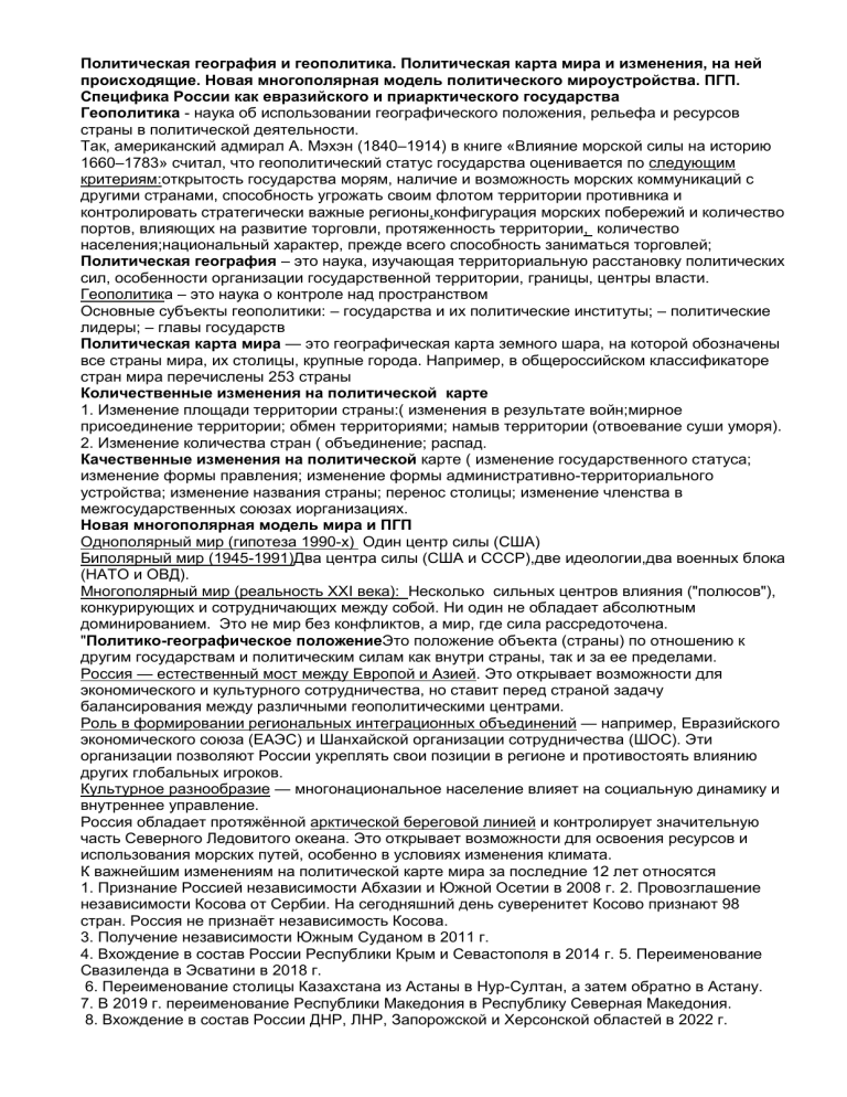 Политическая география и геополитика. Политическая карта мира и изменения, на ней происходящие. Новая многополярная модель политического мироустройства. ПГП. Специфика России как евразийского и приарктического государства Геополитика - наука об использовании географического положения, рельефа и ресурсов страны в политической деятельности. Так, американский адмирал А. Мэхэн (1840–1914) в книге «Влияние морской силы на историю 1660–1783» считал, что геополитический статус государства оценивается по следующим критериям:открытость государства морям, наличие и возможность морских коммуникаций с другими странами, способность угрожать своим флотом территории противника и контролировать стратегически важные регионы,конфигурация морских побережий и количество портов, влияющих на развитие торговли, протяженность территории, количество населения;национальный характер, прежде всего способность заниматься торговлей; Политическая география – это наука, изучающая территориальную расстановку политических сил, особенности организации государственной территории, границы, центры власти. Геополитика – это наука о контроле над пространством Основные субъекты геополитики: – государства и их политические институты; – политические лидеры; – главы государств Политическая карта мира — это географическая карта земного шара, на которой обозначены все страны мира, их столицы, крупные города. Например, в общероссийском классификаторе стран мира перечислены 253 страны Количественные изменения на политической карте 1. Изменение площади территории страны:( изменения в результате войн;мирное присоединение территории; обмен территориями; намыв территории (отвоевание суши уморя). 2. Изменение количества стран ( объединение; распад. Качественные изменения на политической карте ( изменение государственного статуса; изменение формы правления; изменение формы административно-территориального устройства; изменение названия страны; перенос столицы; изменение членства в межгосударственных союзах иорганизациях. Новая многополярная модель мира и ПГП Однополярный мир (гипотеза 1990-х) Один центр силы (США) Биполярный мир (1945-1991)Два центра силы (США и СССР),две идеологии,два военных блока (НАТО и ОВД). Многополярный мир (реальность XXI века): Несколько сильных центров влияния ("полюсов"), конкурирующих и сотрудничающих между собой. Ни один не обладает абсолютным доминированием. Это не мир без конфликтов, а мир, где сила рассредоточена. "Политико-географическое положениеЭто положение объекта (страны) по отношению к другим государствам и политическим силам как внутри страны, так и за ее пределами. Россия — естественный мост между Европой и Азией. Это открывает возможности для экономического и культурного сотрудничества, но ставит перед страной задачу балансирования между различными геополитическими центрами. Роль в формировании региональных интеграционных объединений — например, Евразийского экономического союза (ЕАЭС) и Шанхайской организации сотрудничества (ШОС). Эти организации позволяют России укреплять свои позиции в регионе и противостоять влиянию других глобальных игроков. Культурное разнообразие — многонациональное население влияет на социальную динамику и внутреннее управление. Россия обладает протяжённой арктической береговой лин