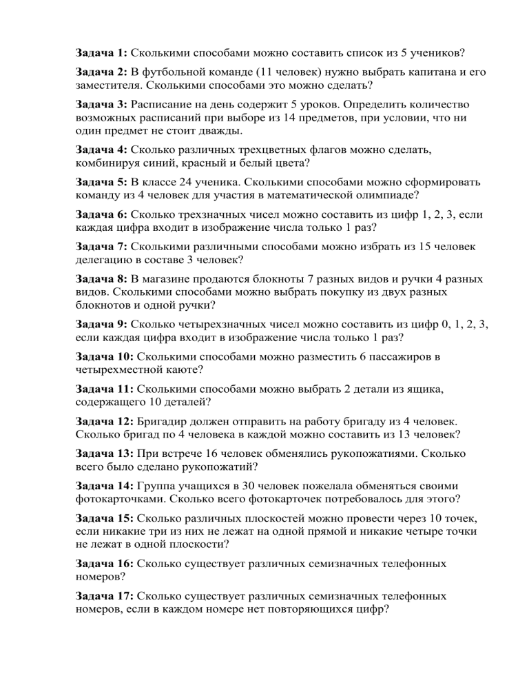 Задача 1: Сколькими способами можно составить список из 5 учеников? Задача 2: В футбольной команде (11 человек) нужно выбрать капитана и его заместителя. Сколькими способами это можно сделать? Задача 3: Расписание на день содержит 5 уроков. Определить количество возможных расписаний при выборе из 14 предметов, при условии, что ни один предмет не стоит дважды. Задача 4: Сколько различных трехцветных флагов можно сделать, комбинируя синий, красный и белый цвета? Задача 5: В классе 24 ученика. Сколькими способами можно сформировать команду из 4 человек для участия в математической олимпиаде? Задача 6: Сколько трехзначных чисел можно составить из цифр 1, 2, 3, если каждая цифра входит в изображение числа только 1 раз? Задача 7: Сколькими различными способами можно избрать из 15 человек делегацию в составе 3 человек? Задача 8: В магазине продаются блокноты 7 разных видов и ручки 4 разных видов. Сколькими способами можно выбрать покупку из двух разных блокнотов и одной ручки? Задача 9: Сколько четырехзначных чисел можно составить из цифр 0, 1, 2, 3, если каждая цифра входит в изображение числа только 1 раз? Задача 10: Сколькими способами можно разместить 6 пассажиров в четырехместной каюте? Задача 11: Сколькими способами можно выбрать 2 детали из ящика, содержащего 10 деталей? Задача 12: Бригадир должен отправить на работу бригаду из 4 человек. Сколько бригад по 4 человека в каждой можно составить из 13 человек? Задача 13: При встрече 16 человек обменялись рукопожатиями. Сколько всего было сделано рукопожатий? Задача 14: Группа учащихся в 30 человек пожелала обменяться своими фотокарточками. Сколько всего фотокарточек потребовалось для этого? Задача 15: Сколько различных плоскостей можно провести через 10 точек, если никакие три из них не лежат на одной прямой и никакие четыре точки не лежат в одной плоскости? Задача 16: Сколько существует различных семизначных телефонных номеров? Задача 17: Сколько существует различных семизначных телефонных номеров, если в каждом номере нет повторяющихся цифр? Задача 18: Сколько существует таких перестановок 7 учеников, при которых 3 определенных ученика находятся рядом друг с другом? Задача 19: На книжной полке стоит собрание сочинений в 30 томах. Сколькими различными способами их можно переставить, чтобы: а) тома 1 и 2 стояли рядом; б) тома 3 и 4 рядом не стояли? Задача 20: Сколько существует трёхзначных чисел, все цифры которых нечётные и различные? Задача 21: У одного мальчика имеется 10 марок для обмена, а у другого – 8. Сколькими способами они могут обменять 2 марки одного на 2 марки другого? Задача 1: Сколькими способами можно составить список из 5 учеников? Ответ: перестановки, 5! = 120. Задача 2: В футбольной команде (11 человек) нужно выбрать капитана и его заместителя. Сколькими способами это можно сделать? Ответ: размещения из 11 по 2, А2 11 = 110. Задача 3: Расписание на день содержит 5 уроков. Определить количество возможных расписаний при выборе из 14 предметов, при условии, что ни один предмет не стоит дважды. Ответ: размещения из 14 по 5, 1320. Задача 4: Сколько различных трехцветных флагов можно сделать, комбинируя синий, красный и белый цвета? Ответ: перестановки, 6 способов. Задача 5: В классе 24 ученика. Сколькими способами можно сформировать команду из 4 человек для участия в математической олимпиаде? Ответ: сочетания из 24 по 4, Задача 6: Сколько трехзначных чи