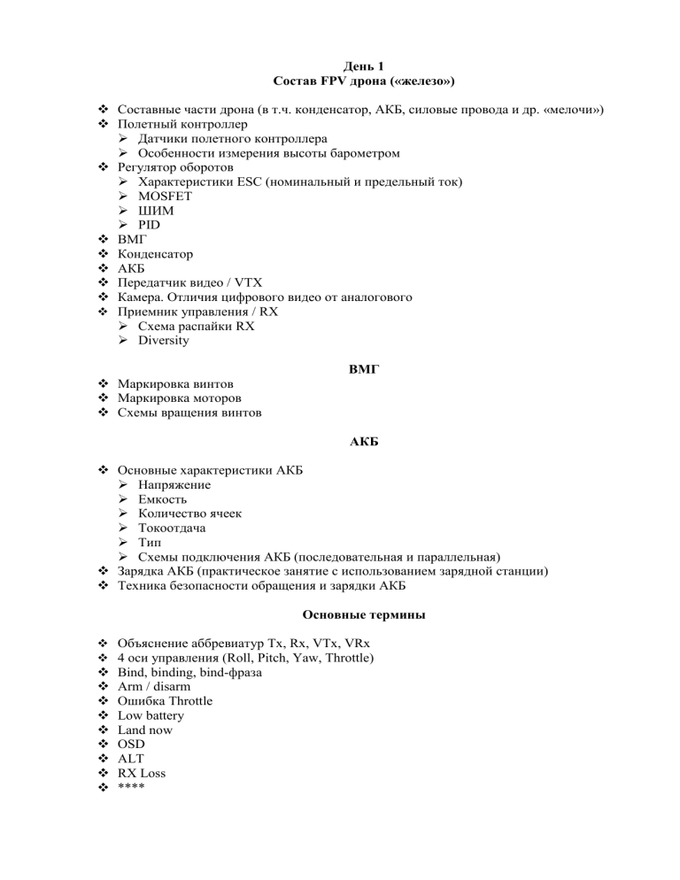 День 1 Состав FPV дрона («железо») Составные части дрона (в т.ч. конденсатор, АКБ, силовые провода и др. «мелочи») Полетный контроллер Датчики полетного контроллера Особенности измерения высоты барометром Регулятор оборотов Характеристики ESC (номинальный и предельный ток) MOSFET ШИМ PID ВМГ Конденсатор АКБ Передатчик видео / VTX Камера. Отличия цифрового видео от аналогового Приемник управления / RX Схема распайки RX Diversity ВМГ Маркировка винтов Маркировка моторов Схемы вращения винтов АКБ Основные характеристики АКБ Напряжение Емкость Количество ячеек Токоотдача Тип Схемы подключения АКБ (последовательная и параллельная) Зарядка АКБ (практическое занятие с использованием зарядной станции) Техника безопасности обращения и зарядки АКБ Основные термины Объяснение аббревиатур Tx, Rx, VTx, VRx 4 оси управления (Roll, Pitch, Yaw, Throttle) Bind, binding, bind-фраза Arm / disarm Ошибка Throttle Low battery Land now OSD ALT RX Loss **** День 2 Радио. Введение Общая базовая теория ЭМ-волны, их параметры Взаимосвязь между длиной волны, частотой и размером антенны Чем выше частота, тем больше информации можно передать. Чем частота ниже, тем меньше информации передается, но тем лучше волна проходит препятствия Понятие направленности антенн. Диаграмма направленности Понятие поляризации и её виды Частоты видео и частоты управления (+TBS) Демонстрация используемых TX, RX, VTX, VRX Демонстрация антенн под TX, RX, VTX, VRX Распределение антенн исходя из направленности (и частично поляризации) на антенны для дронов а для НСУ (объяснение общей логики в форме самостоятельного анализа/опроса с опорой на изученный материал) День 3 Радио. Теоретическая часть КСВ. Определение, допустимые значения, способы измерения и улучшения Факторы, влияющие на дальность связи/полета (прямая видимость, увеличение мощности передатчика, частоты, согласованность антенн (КСВ), соблюдение поляризации) Понятие радиогоризонта и радиотени Понятие выноса и ретранслятора Свойства ЭМ-волн: отражение, дифракция, интерференция Распространение радиоволн в зависимости от местности Сравнение аналогового и цифрового видео Варианты избежания обнаружения при использовании аналогового видео (динамическая мощность VTX и полет на низкой высоте столько, сколько можно) Работа с антенным калькулятором\ Расчет длины антенны под частоту Расчет наиболее подходящей частоты под антенну Работа с Alpine Quest Настройка слоев/карт Работа с точками на карте Прокладывание маршрутов День 4 Протоколы связи ELRS и TBS. Открытый и закрытый протокол + неиспользуемые протоколы Основные настройки ELRS и TBS Дополнительные настройки ELRS и TBS Model Match и Encryption OSD. Основные настройки и их объяснение LQ RSSI и RSSI dBm Напряжение на ячейку Имя пилота Высота Уровень газа Ампераж Прицел и горизонт No handset Grid Baud rate Rate Способы отключения телеметрии Практическая часть Знакомство с пультами Настройка параметров в пульте Включение и выключение JR-модуля День 5. Прошивка ELRS и TBS Практическое занятие Протокол ELRS Описание процесса прошивки Rx ELRS в целом Описание процесса прошивки Tx ELRS Bind ELRS без прошивки Знакомство с вариантами прошивок Описание вкладок при прошивке TX и RX (10.0.0.1) Описание настроек в каждой из вкладок Bind и arm как результат успешной прошивки Протокол TBS Знакомство с TBS AgentLite Описание процесса прошивки Tx TBS Прошивка Rx TBS Bind и arm TBS День 6 BetaFlight. Bind есть, arm’a нет Практическое занятие Знакомство с BF. Обзор ка