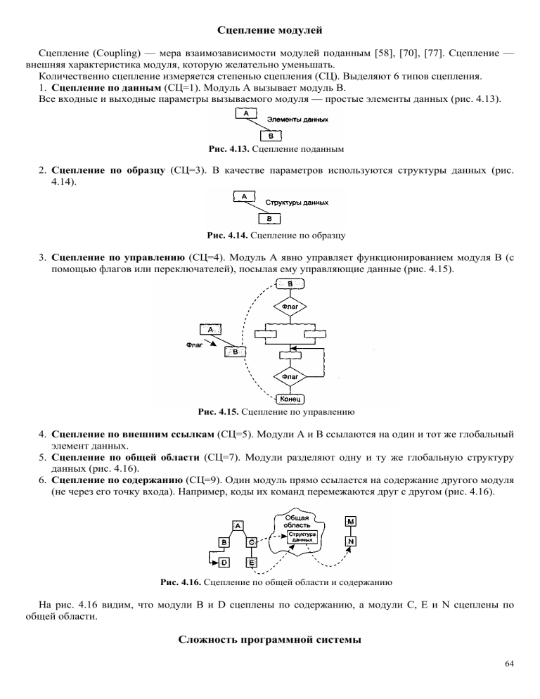 Сцепление модулей Сцепление (Coupling) — мера взаимозависимости модулей поданным [58], [70], [77]. Сцепление — внешняя характеристика модуля, которую желательно уменьшать. Количественно сцепление измеряется степенью сцепления (СЦ). Выделяют 6 типов сцепления. 1. Сцепление по данным (СЦ=1). Модуль А вызывает модуль В. Все входные и выходные параметры вызываемого модуля — простые элементы данных (рис. 4.13). Рис. 4.13. Сцепление поданным 2. Сцепление по образцу (СЦ=3). В качестве параметров используются структуры данных (рис. 4.14). Рис. 4.14. Сцепление по образцу 3. Сцепление по управлению (СЦ=4). Модуль А явно управляет функционированием модуля В (с помощью флагов или переключателей), посылая ему управляющие данные (рис. 4.15). Рис. 4.15. Сцепление по управлению 4. Сцепление по внешним ссылкам (СЦ=5). Модули А и В ссылаются на один и тот же глобальный элемент данных. 5. Сцепление по общей области (СЦ=7). Модули разделяют одну и ту же глобальную структуру данных (рис. 4.16). 6. Сцепление по содержанию (СЦ=9). Один модуль прямо ссылается на содержание другого модуля (не через его точку входа). Например, коды их команд перемежаются друг с другом (рис. 4.16). Рис. 4.16. Сцепление по общей области и содержанию На рис. 4.16 видим, что модули В и D сцеплены по содержанию, а модули С, Е и N сцеплены по общей области. Сложность программной системы 64 В простейшем случае сложность системы определяется как сумма мер сложности ее модулей. Сложность модуля может вычисляться различными способами. Например, М. Холстед (1977) предложил меру длины N модуля [33]: N ≈ n1log2 (n1) + n2log2(n2), где n1 — число различных операторов, п2 — число различных операндов. В качестве второй метрики М. Холстед рассматривал объем V модуля (количество символов для записи всех операторов и операндов текста программы): V = N x log2 (n1 + n2). Вместе с тем известно, что любая сложная система состоит из элементов и системы связей между элементами и что игнорировать внутрисистемные связи неразумно. Том МакКейб (1976) при оценке сложности ПС предложил исходить из топологии внутренних связей [49]. Для этой цели он разработал метрику цикломатической сложности: V(G) = E-N + 2, где Е — количество дуг, a.N — количество вершин в управляющем графе ПС. Это был шаг в нужном направлении. Дальнейшее уточнение оценок сложности потребовало, чтобы каждый модуль мог представляться как локальная структура, состоящая из элементов и связей между ними. Таким образом, при комплексной оценке сложности ПС необходимо рассматривать меру сложности модулей, меру сложности внешних связей (между модулями) и меру сложности внутренних связей (внутри модулей) [28], [56]. Традиционно со внешними связями сопоставляют характеристику «сцепление», а с внутренними связями — характеристику «связность». Вопросы комплексной оценки сложности обсудим в следующем разделе. Характеристики иерархической структуры программной системы Иерархическая структура программной системы — основной результат предварительного проектирования. Она определяет состав модулей ПС и управляющие отношения между модулями. В этой структуре модуль более высокого уровня (начальник) управляет модулем нижнего уровня (подчиненным). Иерархическая структура не отражает процедурные особенности программной системы, то есть последовательность операций, их повторение, ветвления и т. д. Рассмотрим основные характеристики иерархичес