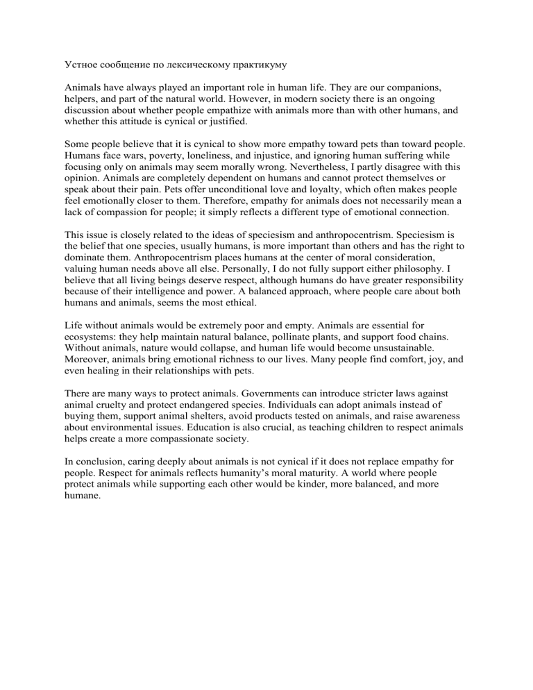 Устное сообщение по лексическому практикуму Animals have always played an important role in human life. They are our companions, helpers, and part of the natural world. However, in modern society there is an ongoing discussion about whether people empathize with animals more than with other humans, and whether this attitude is cynical or justified. Some people believe that it is cynical to show more empathy toward pets than toward people. Humans face wars, poverty, loneliness, and injustice, and ignoring human suffering while focusing only on animals may seem morally wrong. Nevertheless, I partly disagree with this opinion. Animals are completely dependent on humans and cannot protect themselves or speak about their pain. Pets offer unconditional love and loyalty, which often makes people feel emotionally closer to them. Therefore, empathy for animals does not necessarily mean a lack of compassion for people; it simply reflects a different type of emotional connection. This issue is closely related to the ideas of speciesism and anthropocentrism. Speciesism is the belief that one species, usually humans, is more important than others and has the right to dominate them. Anthropocentrism places humans at the center of moral consideration, valuing human needs above all else. Personally, I do not fully support either philosophy. I believe that all living beings deserve respect, although humans do have greater responsibility because of their intelligence and power. A balanced approach, where people care about both humans and animals, seems the most ethical. Life without animals would be extremely poor and empty. Animals are essential for ecosystems: they help maintain natural balance, pollinate plants, and support food chains. Without animals, nature would collapse, and human life would become unsustainable. Moreover, animals bring emotional richness to our lives. Many people find comfort, joy, and even healing in their relationships with pets. There are many ways to protect animals. Governments can introduce stricter laws against animal cruelty and protect endangered species. Individuals can adopt animals instead of buying them, support animal shelters, avoid products tested on animals, and raise awareness about environmental issues. Education is also crucial, as teaching children to respect animals helps create a more compassionate society. In conclusion, caring deeply about animals is not cynical if it does not replace empathy for people. Respect for animals reflects humanity’s moral maturity. A world where people protect animals while supporting each other would be kinder, more balanced, and more humane.
