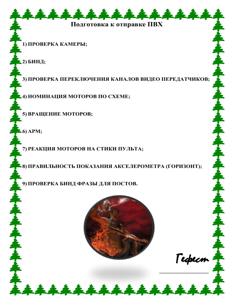 Подготовка к отправке ПВХ 1) ПРОВЕРКА КАМЕРЫ; 2) БИНД; 3) ПРОВЕРКА ПЕРЕКЛЮЧЕНИЯ КАНАЛОВ ВИДЕО ПЕРЕДАТЧИКОВ; 4) НОМИНАЦИЯ МОТОРОВ ПО СХЕМЕ; 5) ВРАЩЕНИЕ МОТОРОВ; 6) АРМ; 7) РЕАКЦИЯ МОТОРОВ НА СТИКИ ПУЛЬТА; 8) ПРАВИЛЬНОСТЬ ПОКАЗАНИЯ АКСЕЛЕРОМЕТРА (ГОРИЗОНТ); 9) ПРОВЕРКА БИНД ФРАЗЫ ДЛЯ ПОСТОВ. Гефест ___________________