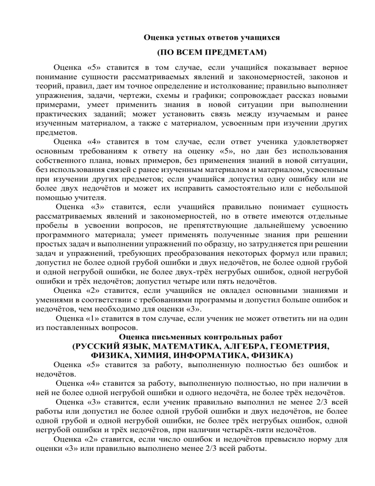 Оценка устных ответов учащихся (ПО ВСЕМ ПРЕДМЕТАМ) Оценка «5» ставится в том случае, если учащийся показывает верное понимание сущности рассматриваемых явлений и закономерностей, законов и теорий, правил, дает им точное определение и истолкование; правильно выполняет упражнения, задачи, чертежи, схемы и графики; сопровождает рассказ новыми примерами, умеет применить знания в новой ситуации при выполнении практических заданий; может установить связь между изучаемым и ранее изученным материалом, а также с материалом, усвоенным при изучении других предметов. Оценка «4» ставится в том случае, если ответ ученика удовлетворяет основным требованиям к ответу на оценку «5», но дан без использования собственного плана, новых примеров, без применения знаний в новой ситуации, без использования связей с ранее изученным материалом и материалом, усвоенным при изучении других предметов; если учащийся допустил одну ошибку или не более двух недочётов и может их исправить самостоятельно или с небольшой помощью учителя. Оценка «3» ставится, если учащийся правильно понимает сущность рассматриваемых явлений и закономерностей, но в ответе имеются отдельные пробелы в усвоении вопросов, не препятствующие дальнейшему усвоению программного материала; умеет применять полученные знания при решении простых задач и выполнении упражнений по образцу, но затрудняется при решении задач и упражнений, требующих преобразования некоторых формул или правил; допустил не более одной грубой ошибки и двух недочётов, не более одной грубой и одной негрубой ошибки, не более двух-трёх негрубых ошибок, одной негрубой ошибки и трёх недочётов; допустил четыре или пять недочётов. Оценка «2» ставится, если учащийся не овладел основными знаниями и умениями в соответствии с требованиями программы и допустил больше ошибок и недочётов, чем необходимо для оценки «3». Оценка «1» ставится в том случае, если ученик не может ответить ни на один из поставленных вопросов. Оценка письменных контрольных работ (РУССКИЙ ЯЗЫК, МАТЕМАТИКА, АЛГЕБРА, ГЕОМЕТРИЯ, ФИЗИКА, ХИМИЯ, ИНФОРМАТИКА, ФИЗИКА) Оценка «5» ставится за работу, выполненную полностью без ошибок и недочётов. Оценка «4» ставится за работу, выполненную полностью, но при наличии в ней не более одной негрубой ошибки и одного недочёта, не более трёх недочётов. Оценка «3» ставится, если ученик правильно выполнил не менее 2/3 всей работы или допустил не более одной грубой ошибки и двух недочётов, не более одной грубой и одной негрубой ошибки, не более трёх негрубых ошибок, одной негрубой ошибки и трёх недочётов, при наличии четырёх-пяти недочётов. Оценка «2» ставится, если число ошибок и недочётов превысило норму для оценки «3» или правильно выполнено менее 2/3 всей работы. Оценка «1» ставится, если ученик совсем не выполнил ни одного задания. Оценка практических работ (ХИМИЯ, ФИЗИКА, ГЕОГРАФИЯ, ИНФОРМАТИКА) Оценка «5» ставится, если учащийся выполняет работу в полном объеме с соблюдением необходимой последовательности проведения опытов и измерений; самостоятельно и рационально монтирует необходимое оборудование; все опыты проводит в условиях и режимах, обеспечивающих получение правильных результатов и выводов; соблюдает требования правил техники безопасности; правильно и аккуратно выполняет все записи, таблицы, рисунки, чертежи, 
